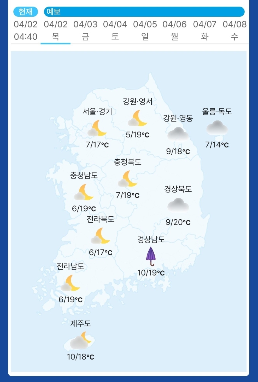 ✫청주(☀️)➠(☀️) 5℃ ~ 19℃