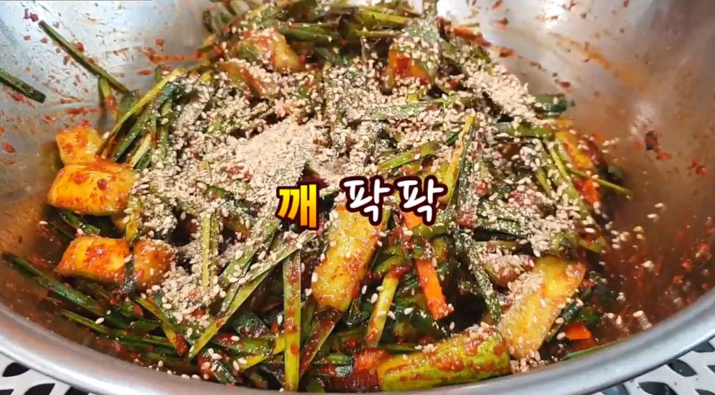 이제 오이를 넣고 버무린 다음, 올리고당 3수저를 넣고 깨를 팍팍 뿌려줍니다~