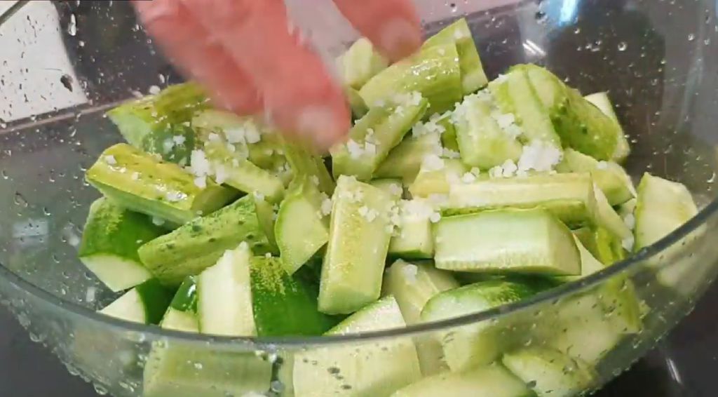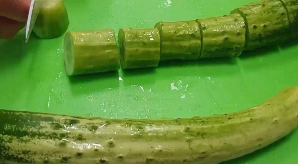 씻은 오이를 가로로 7등분, 세로로 4등분 깍둑깍둑 잘라주어요.