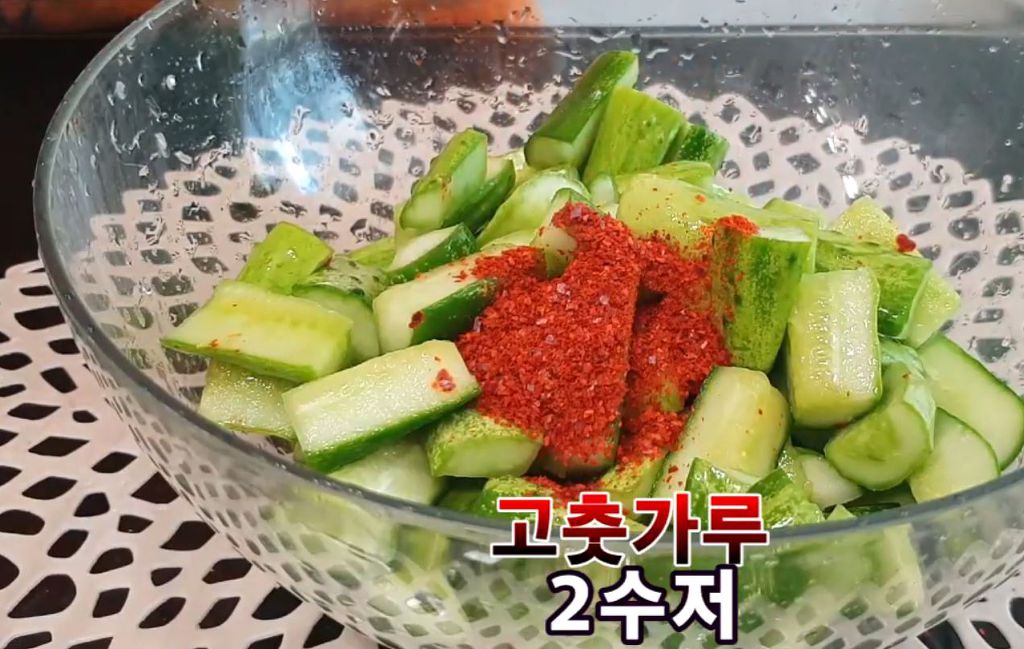 20분 뒤에 고춧가루 2수저를 넣고 오이를 버무려 줍니다~