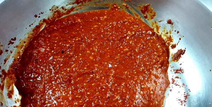 버무려서 고추가루가 불게