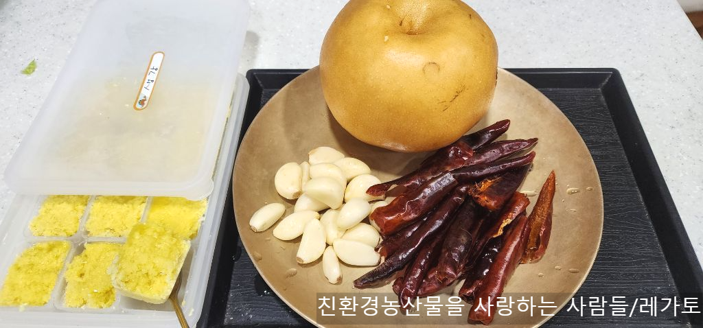 다진마늘, 생강, 배, 사과즙 함께 갈아 넣었어요.