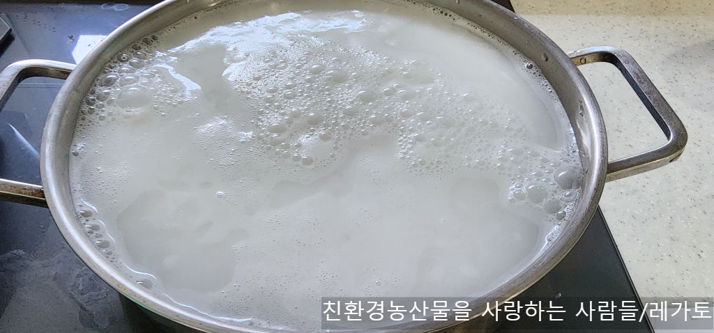 찹쌀을 불려 갈아서 풀물을 끓였어요.