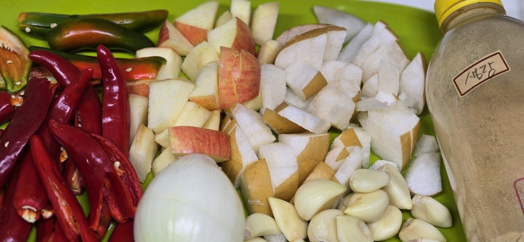 *붉은고추,사과,배,양파,마늘, 생강 ,새우젓,멸치액젓,오미자청,불린흰콩, 스테비아,고추가루를 넣고 *갈아줍니다