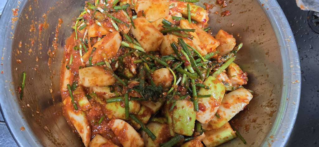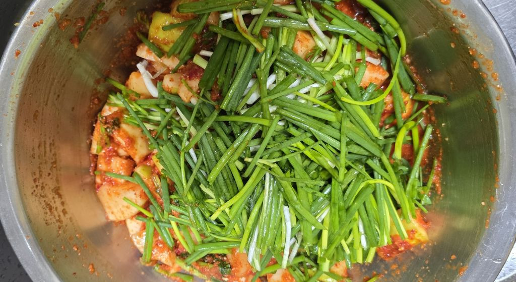 갈아준 양념을 고추가루물들인 무우에 넣어 버무리고 쪽파를