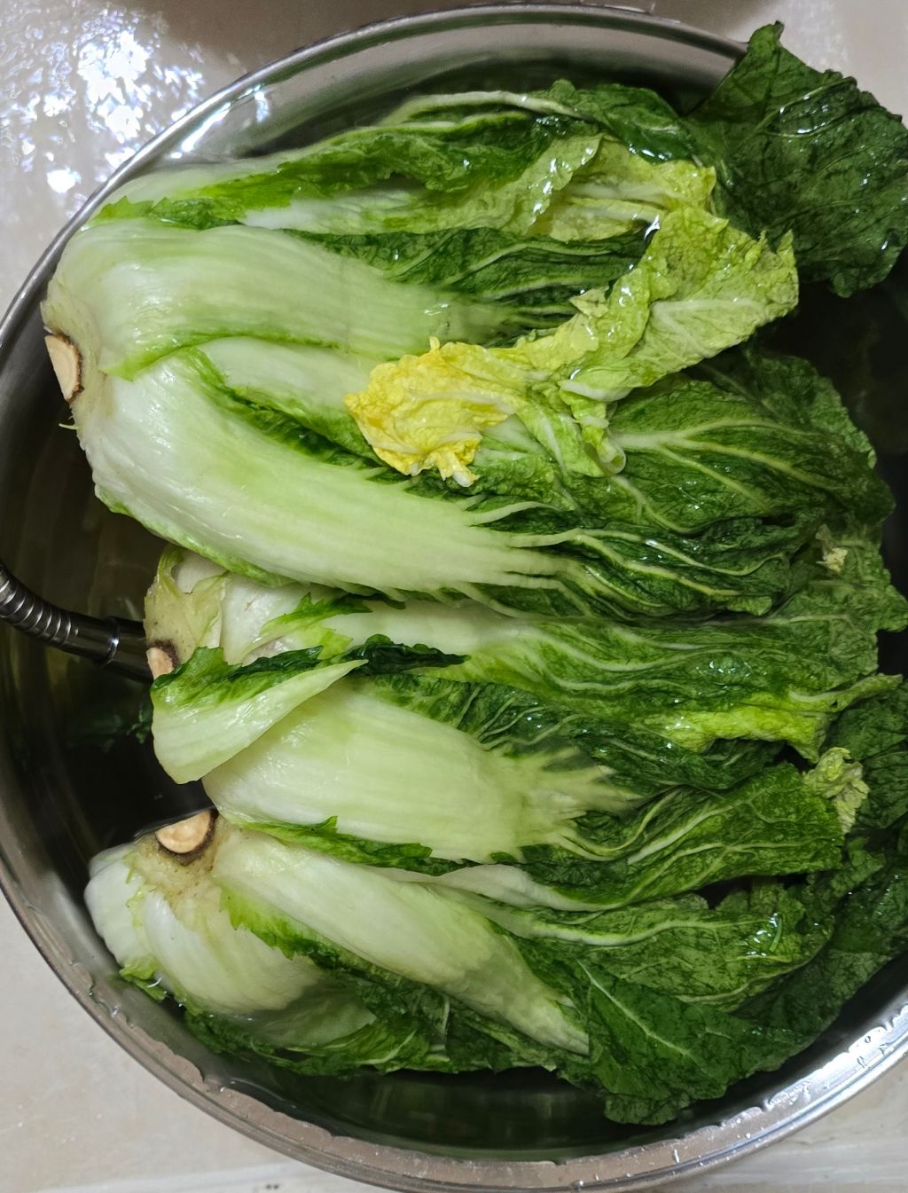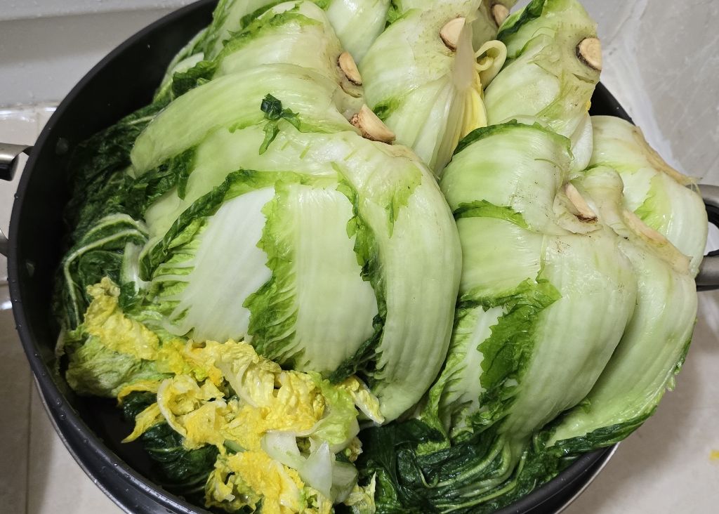 소금을 적게 사용해서 짜지 않게 오랜시간 절이는 방법을 선택해서 꽉찬 하루, 가끔 뒤집어가며 삼삼하게 절였습니다