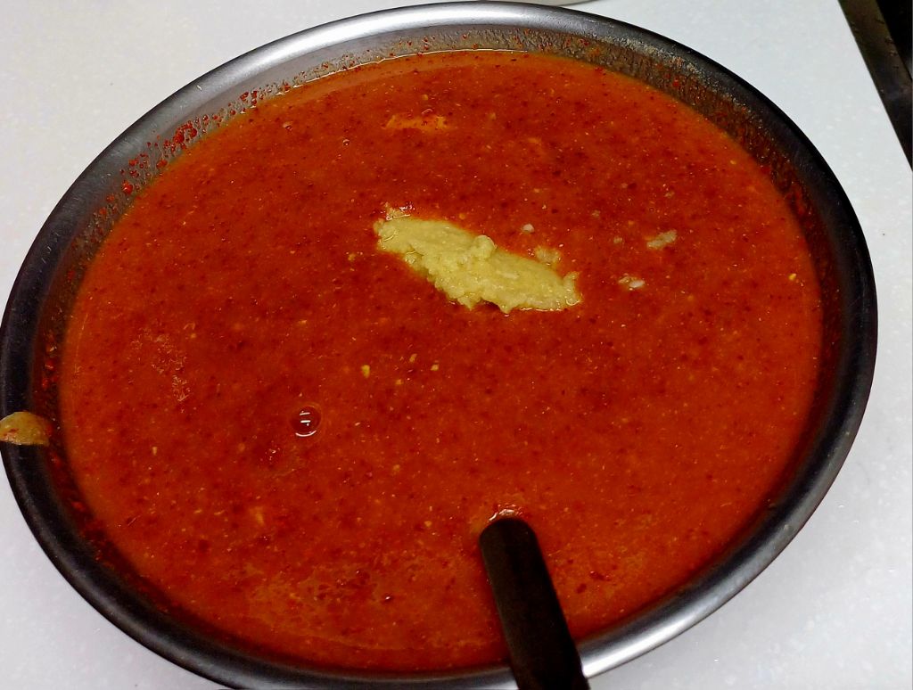 풀국에 갈아놓은 재료들 넣고 마늘 생강 오미자효소