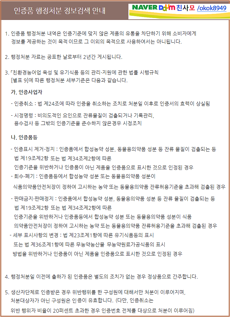 친환경 인증 지역을 통해 행정처분 정보 안내 작성자올레길|작성시간25.01.24|조회수76 목록 댓글 0 글자크기 작게가 글자크기 크게가 폭염 날씨 기후 변화에 따라 친환경 농가가 자진포기 하는 경우가 많아지고 있습니다.지역을 통해 행정처분 정보 안내 참고용, 이미지 클릭 하세요..행정처분 인증번호 및 인증자, 지역을 통해 행정처분 정보를 확인하세요.행정처분 정보검색인증번호인증자지역 전체 서울특별시부산광역시대구광역시인천광역시광주광역시대전광역시울산광역시세종특별자치시경기도강원특별자치도충청북도충청남도전북특별자치도전라남도경상북도경상남도제주특별자치도해외 전체 서귀포시제주시 전체 검색※ 인증품 행정처분 정보검색 안내 내용보기 누르시면 이동됩니다. 다음검색 현재 게시글 추가 기능 열기 북마크 공유하기 신고 센터로 신고 댓글 댓글 0 댓글쓰기 답글쓰기 댓글 리스트