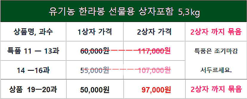 유기농 한라봉 가정용 50과이내 85,000원 60과 과 이내 80,000원