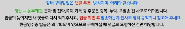 | 환불 및 교환 사항: 배송상태 조건 표시 | 오, 발송 재품의 하자시 교환 및 환불해 드리며, 농산물 신선식품일경우(수령 즉시 연락요)주소 오기재 및 통화 부재 시 배송되지 않으니 주문서 작성하시고 재확인해주세요. | ||