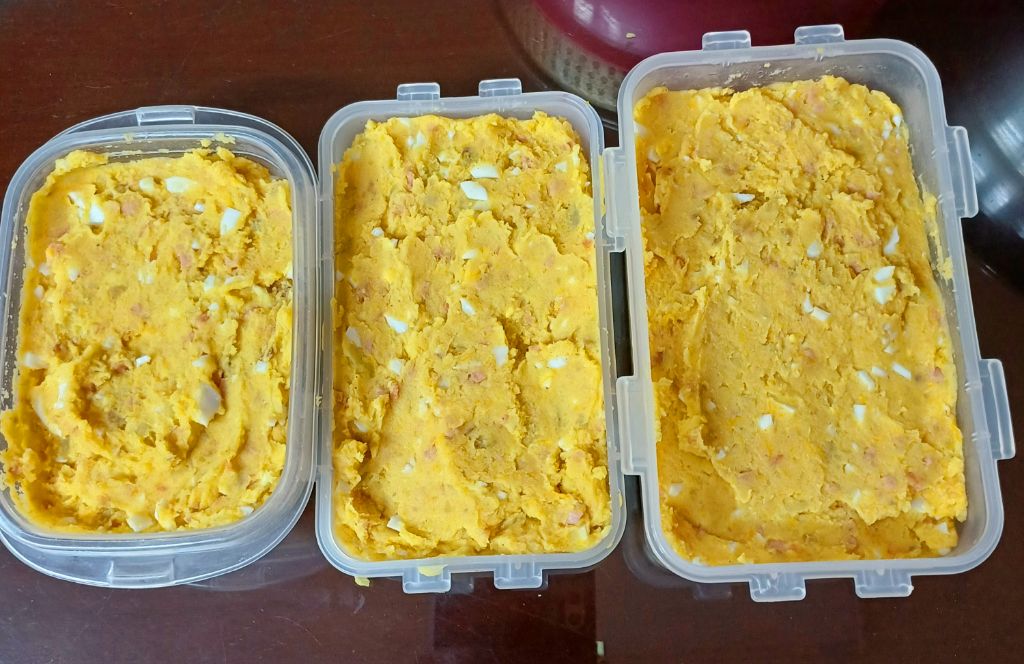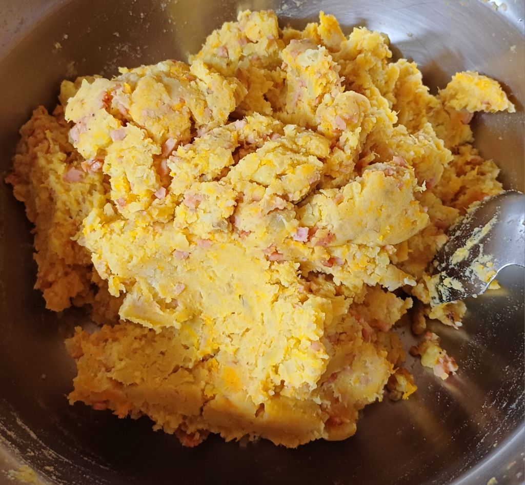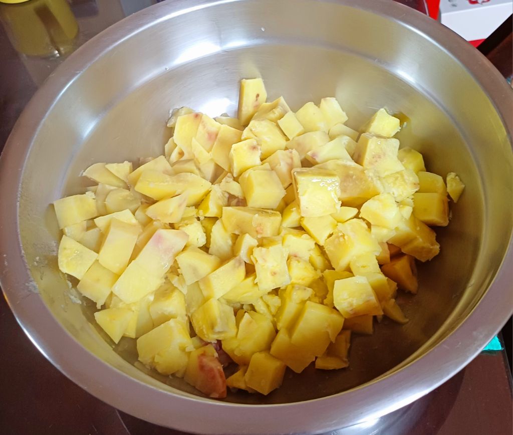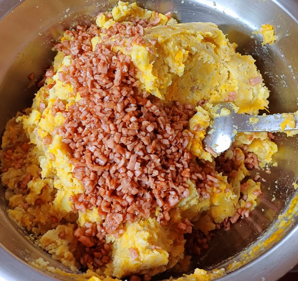 감자셀러드: 감자 고구마 잘게 썰어 쪄서 방망이로 어게 줍니다 삶은밤 (속 파서)넣습니다 햄 1통 잘게 다져 한번 볶아요 넣어요