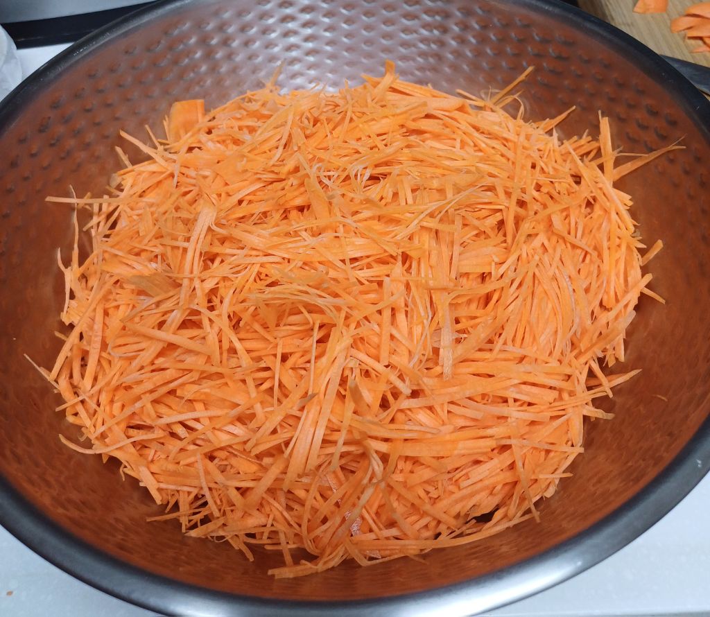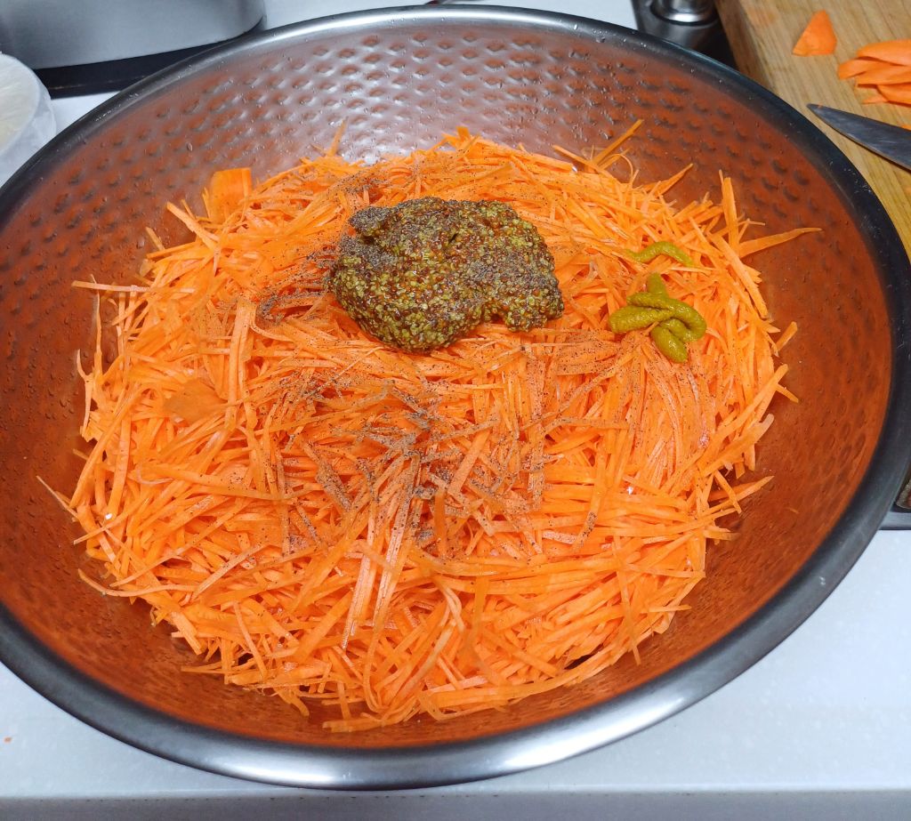 당근라페 :당근을 슬라이스해서 곱게 채썰어 레몬즙 씨겨자 소금으로 절임을 합니다