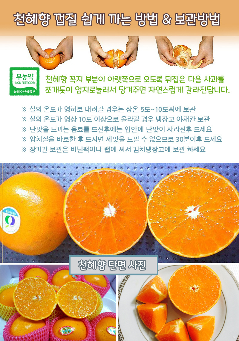 | 구매시 주의사항 및 보관 방법 | 박스째 그냥 두면 부패될 수 있습니다. 천혜향은 후숙과일이라 상온의 서늘한곳에서 3~5일간 보관후 드세요. 3월엔 단 맛이 강해진 천혜향을 받았다면, 바로 신문지나 키친타올에 사서 서늘한 곳에 보관해 두시면서 드세요. 장기 보관은 신문지나 키친타올에 싼다음 비닐팩에 넣어 냉장보관, 농산물이므로 개인적인 맛, 외관상 모양으로 인한 반품은 불가합니다. |