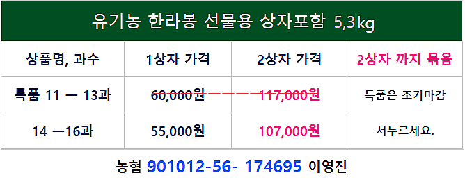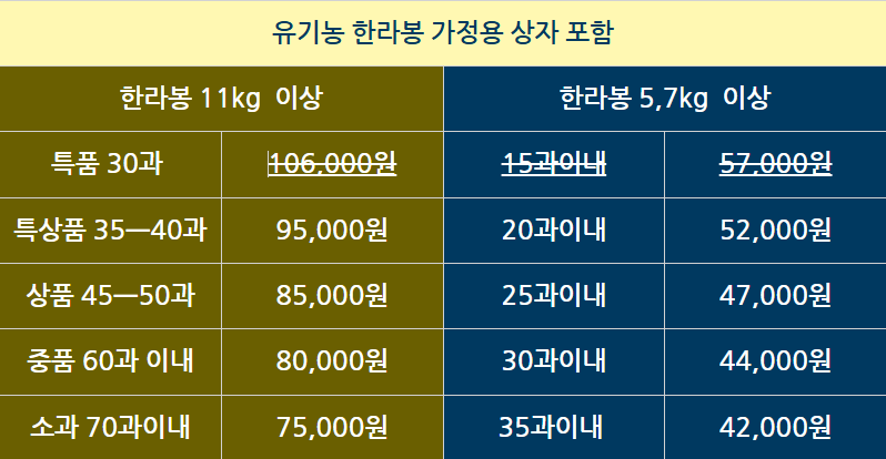 유기농 한라봉 가정용 50과이내 85,000원 60과 과 이내 80,000원