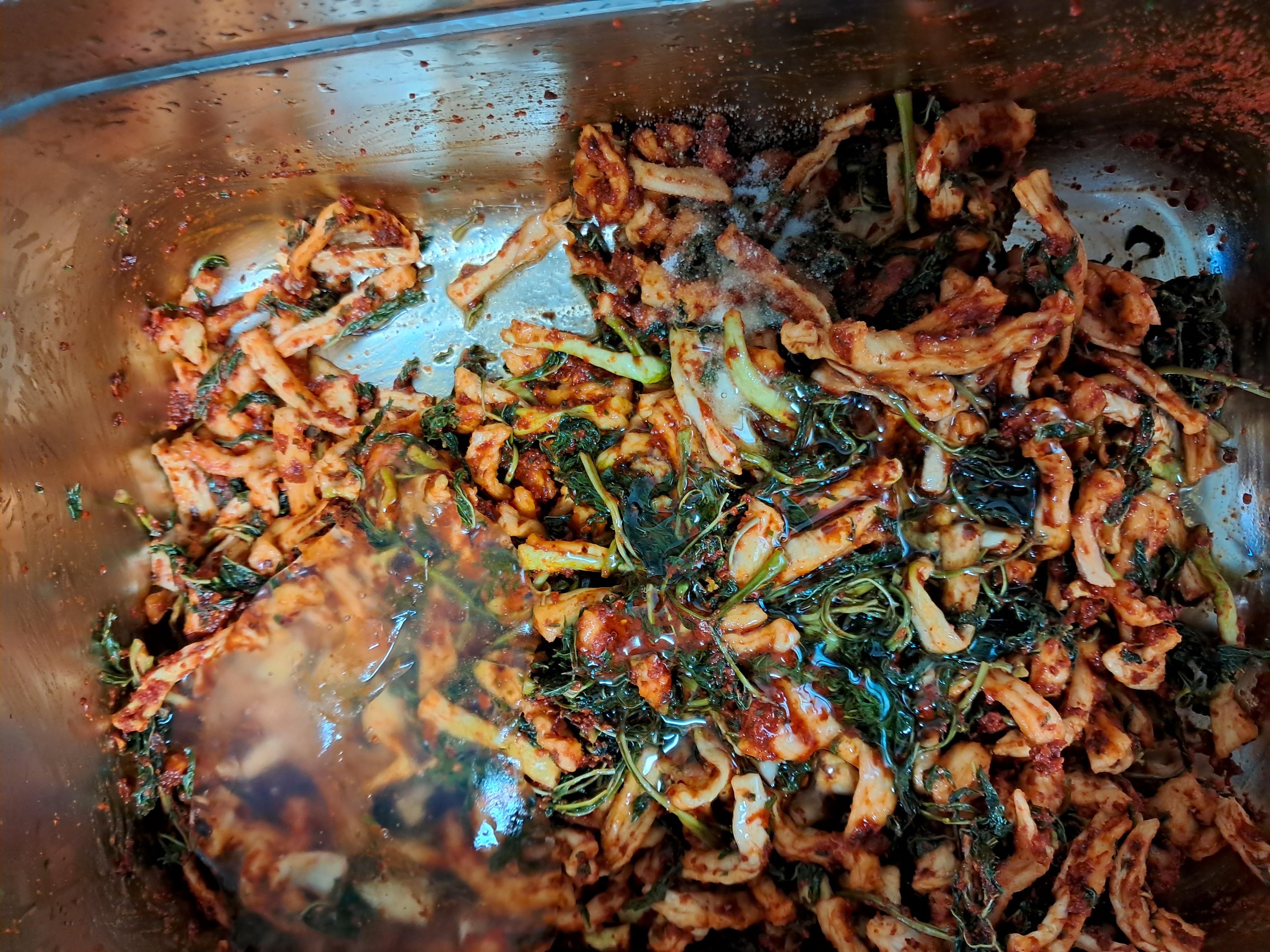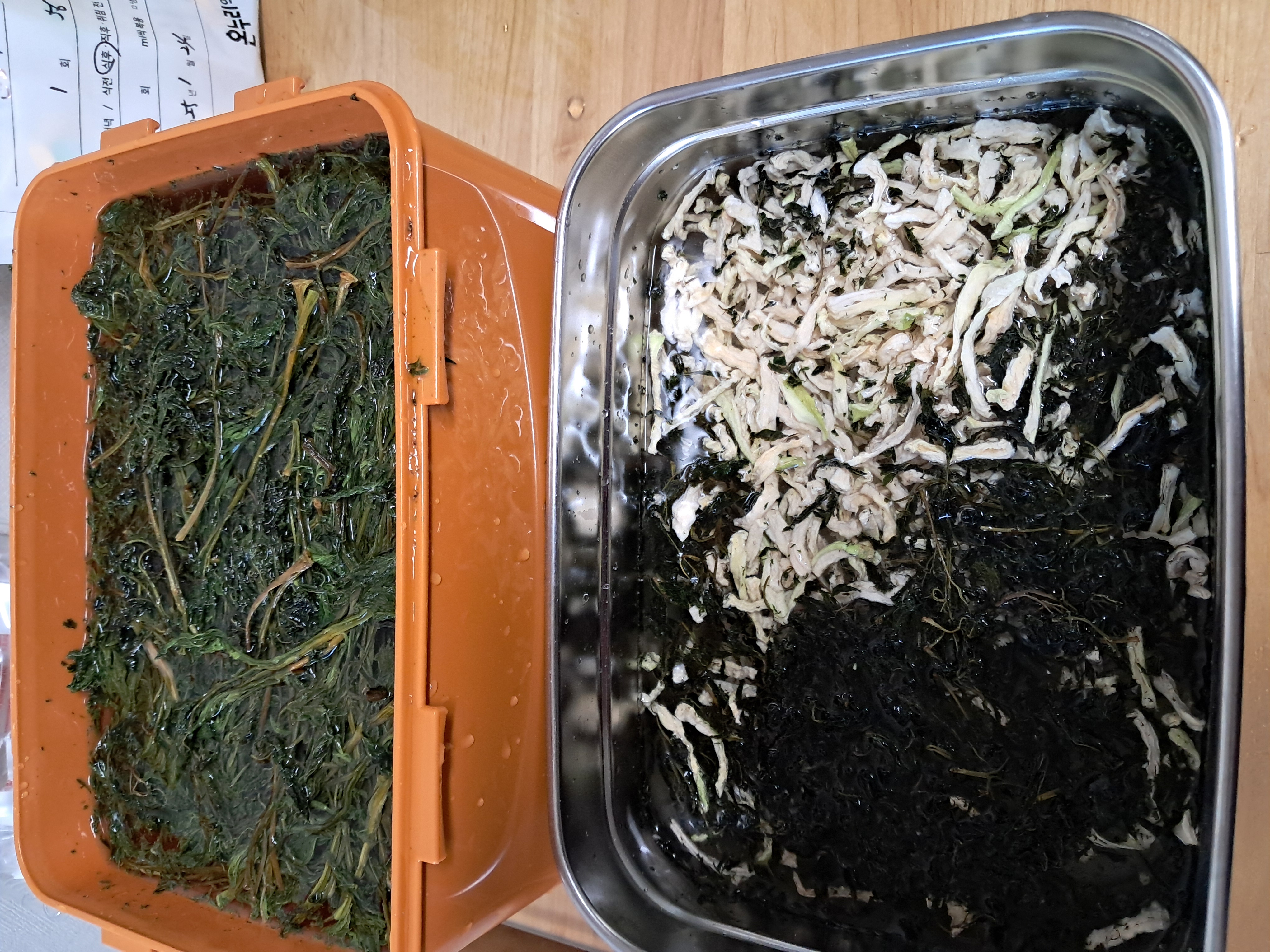 불려 놓은. 무우말랭. 고추잎. 꼬옥 짜서