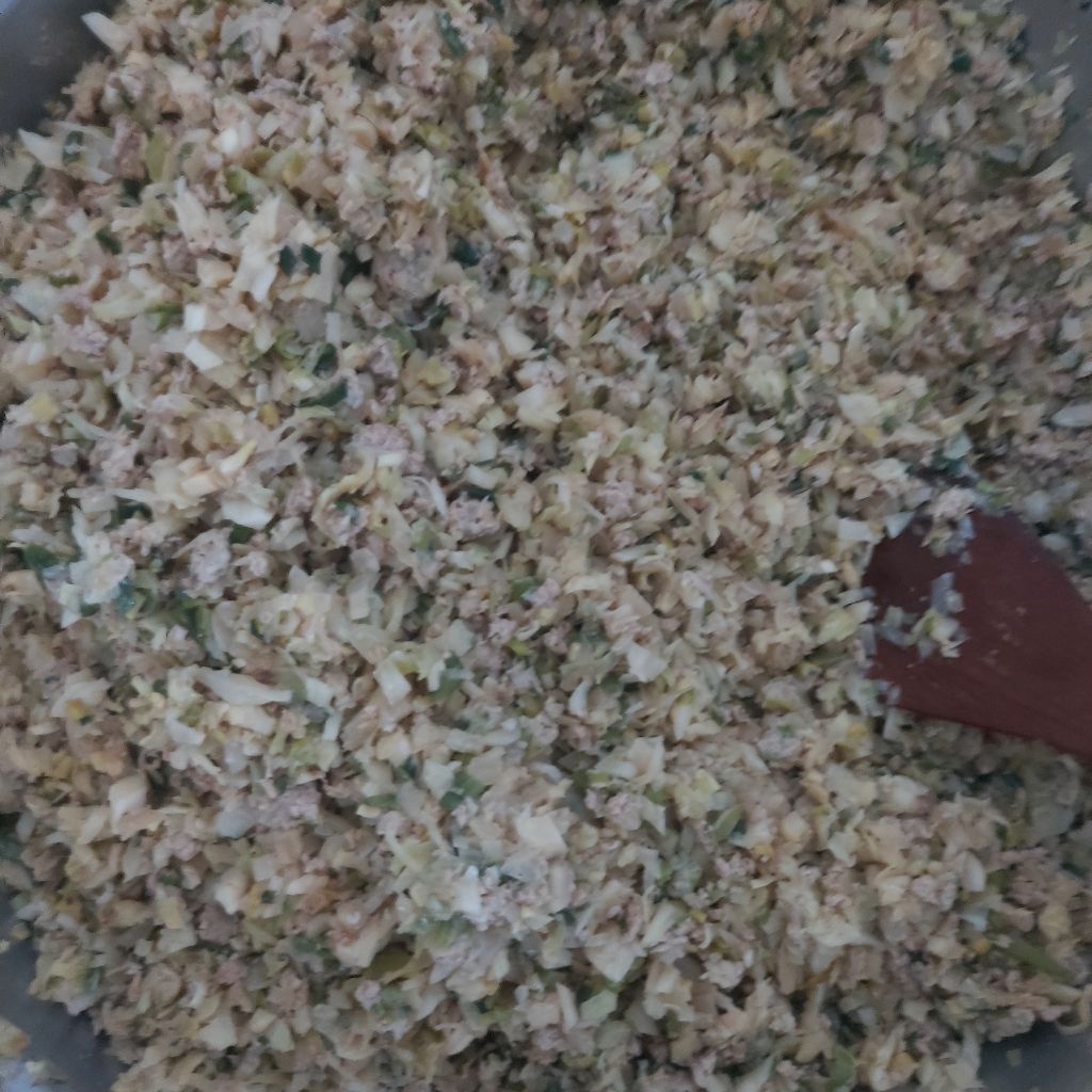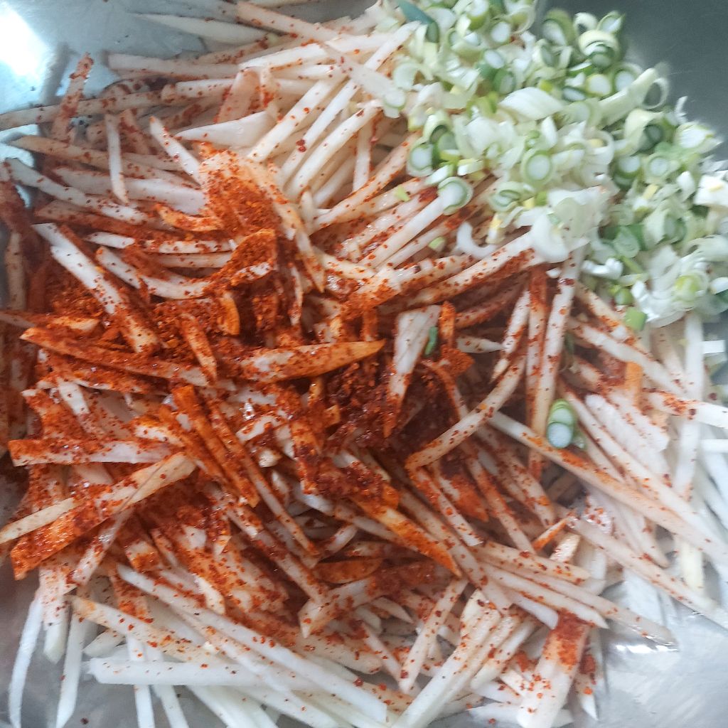 무채에 파만 다져 넣고 참치액 넣고 조물 조물~