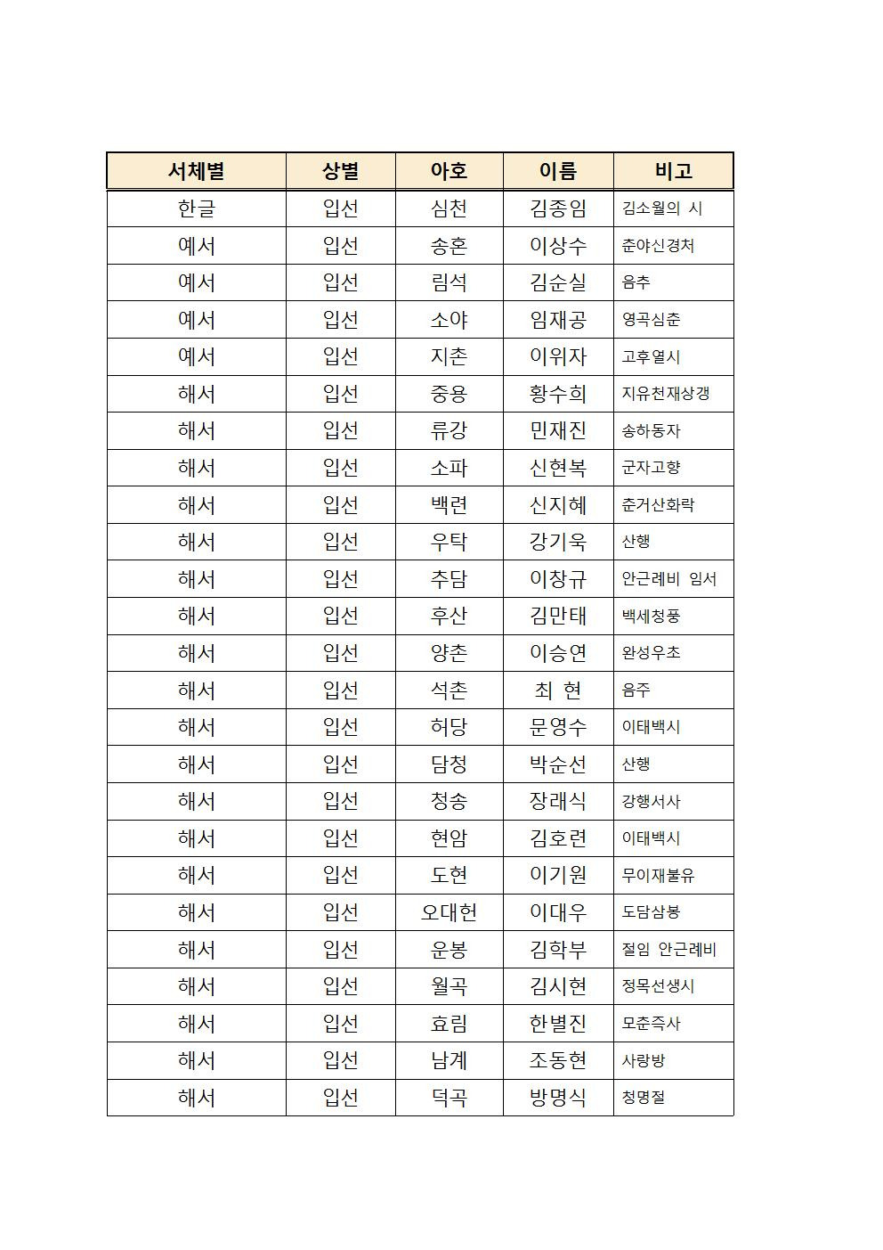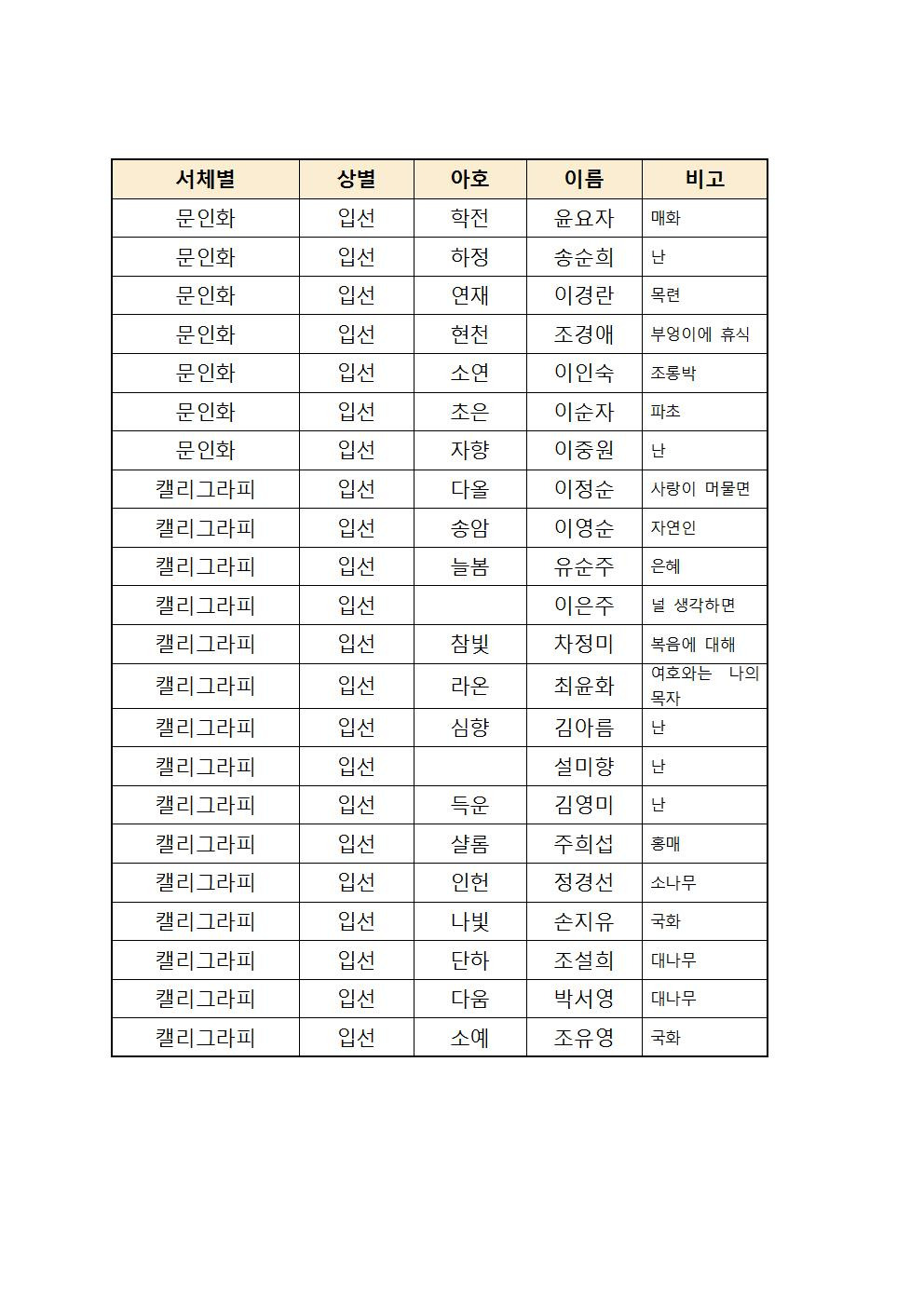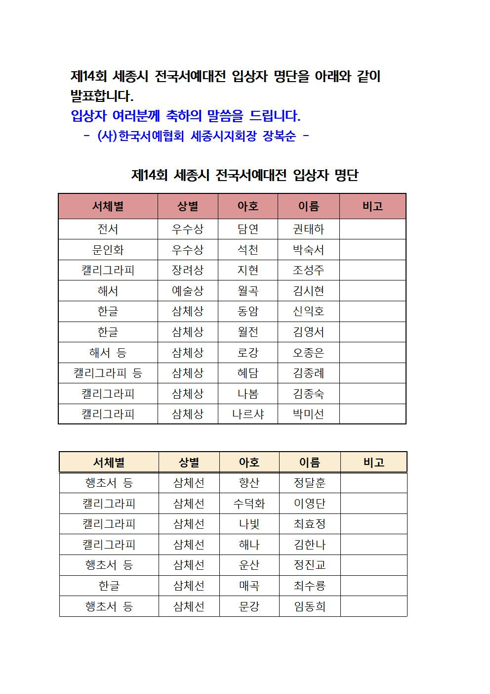 제14회 세종시 전국서예대전 입상자 명단 발표 작성자송천|작성시간25.07.11|조회수537 목록 댓글 0 글자크기 작게가 글자크기 크게가 다음검색 현재 게시글 추가 기능 열기 북마크 공유하기 신고 센터로 신고 댓글 댓글 0 댓글쓰기 답글쓰기 댓글 리스트