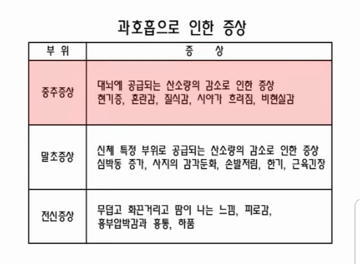 우리 몸에서 산소가 너무 많이 흡입되면 위의 도표같은 증상들이 일어납니다.