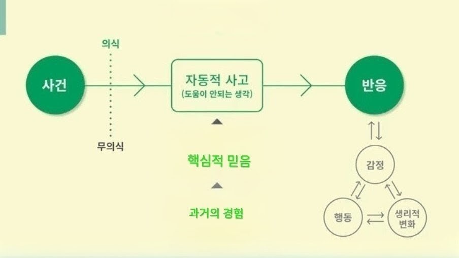 ▪︎ 어떤 상황으로 사건이 일어나면 (무의식+의식) --->생각은 무의식적으로 "자동적 사고" 가 일어납니다.