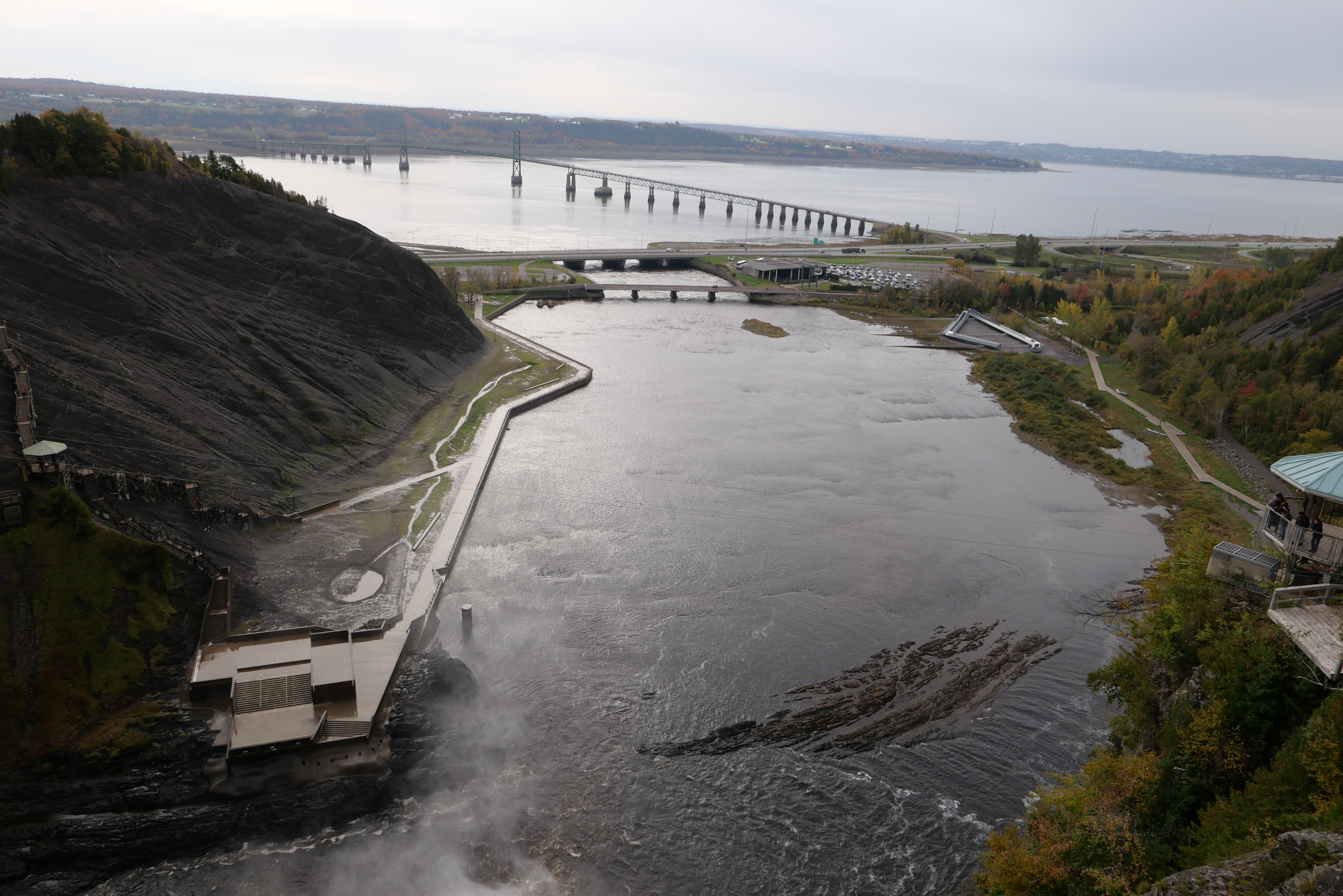 폭포 난관 전망대에서 바라다 본 아래 풍경. 세인트로렌스 강과 다리가 아름답다.