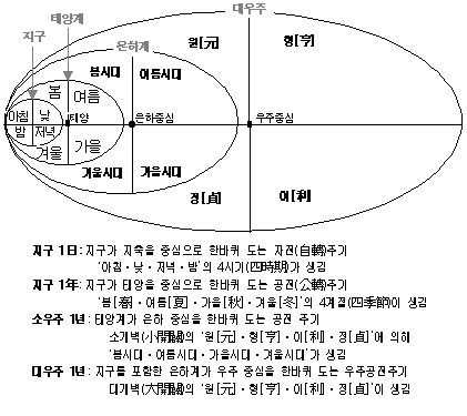 그리고 우주의 1년은 원(元) • 형(亨) • 이(利) • 정(貞)이라는 우주의 4계절을 가진다. 그러므로 우주의 일년 중 한 계절은 32,400년으로 소우주가 3번 변하는 주기인 것이며, 소우주가 열두 번 개벽을 하면 대우주가 한 번 대개벽(大開闢)을 하는 것이다.