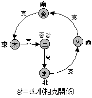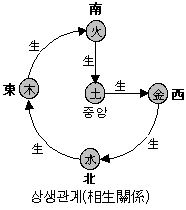 이러한 오기(五氣)의 상생(相生)과 상극(相克) 관계를 하나의 그림으로 나타내 보면 다음과 같다.