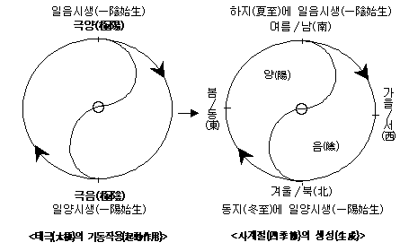 무극의 기저상태에서 태극의 기동(起動)이 시작되면 양(陽)이 일어나게 되고, 이것이 극(極)에 달하면 음(陰)이 일어나며, 다시 음(陰)이 극(極)에 달하게 되면 양(陽)이 일어난다.