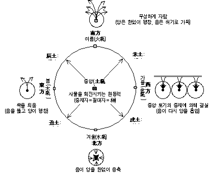 그러므로 앞의 그림에서 보는 바와 같이 토기(土氣)는 사유(四維) 앞에 자리하여 각 기(氣)의 변화를 유도하는 중재작용을 한다.