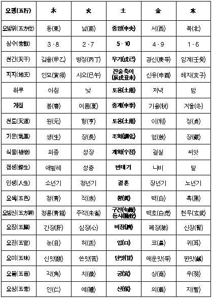 오행(五行)은 오기(五氣)로써 음기(陰氣)와 양기(陽氣)가 어우러져서 생성시킨 다섯 가지의 동적(動的)인 정기(精氣)이다. 오기(五氣)는 목(木) • 화(火) • 토(土) • 금(金) • 수(水)의 다섯 가지 기(氣)이다.