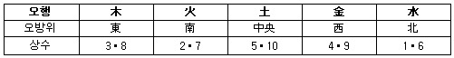그리고 앞에서 살펴보았듯이 오행(五行)의 방위(方位)와 상수(常數)의 관계는 다음과 같다.
