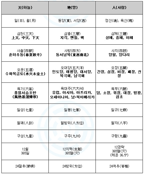 다음의 표에 나와 있는 천(天) • 지(地) • 인(人)의 이러한 연관관계를 보면 인간이 왜 소천지(小天地)인지를 더욱 확연하게 알 수 있을 것이다.