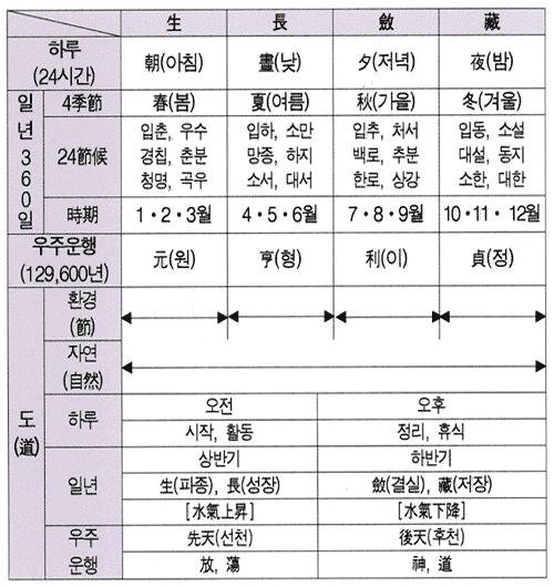 이러한 생(生) • 장(長) • 염(斂) • 장(藏)을 사의(四儀)라 하며 사의가 하루에, 일년에, 우주운행에 그리고 천지(天地) 대도(大道)에 어떻게 나타나는지를 표와 그림으로 나타내 보면 다음과 같다.