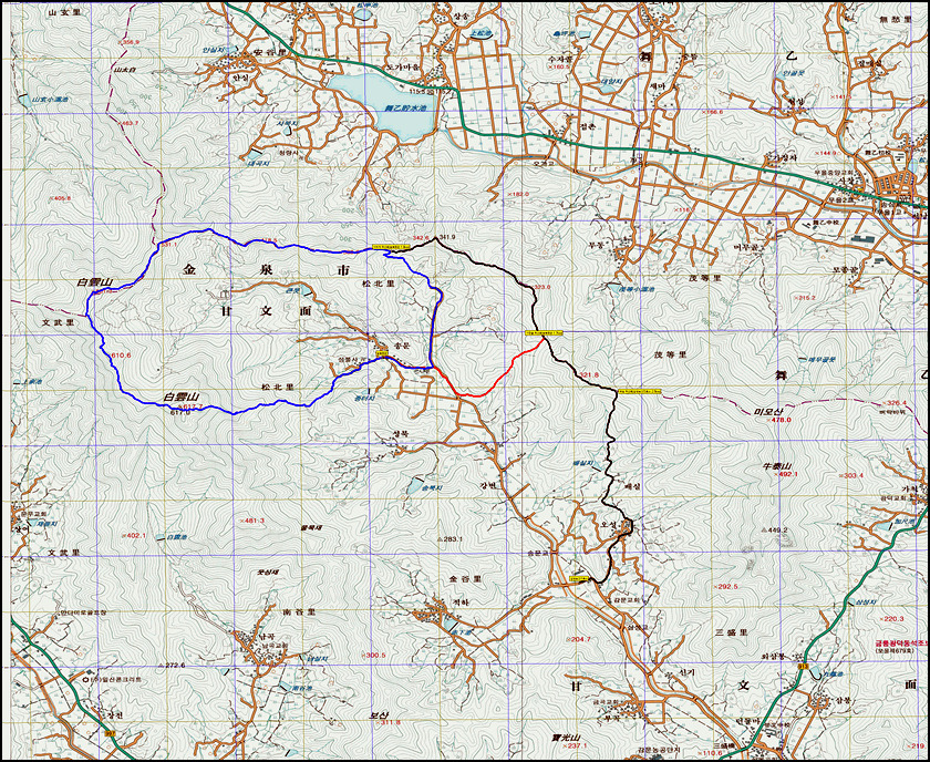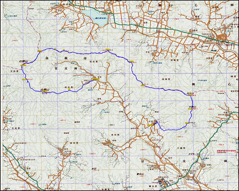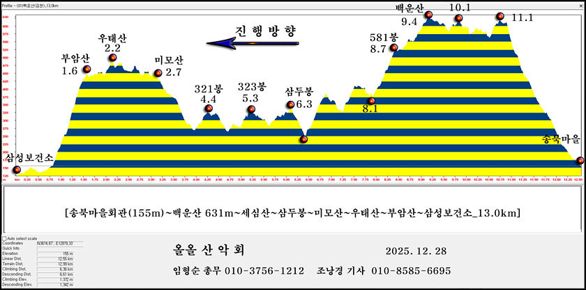 C 코스: 송북회관~백운산~세심산~백운산~이터재~323봉~321봉~배실 하산~삼성보건진료소 11.0km