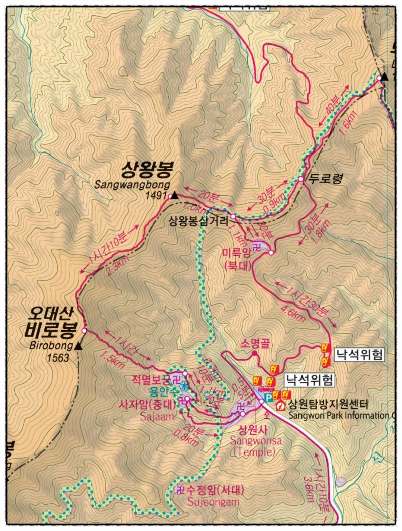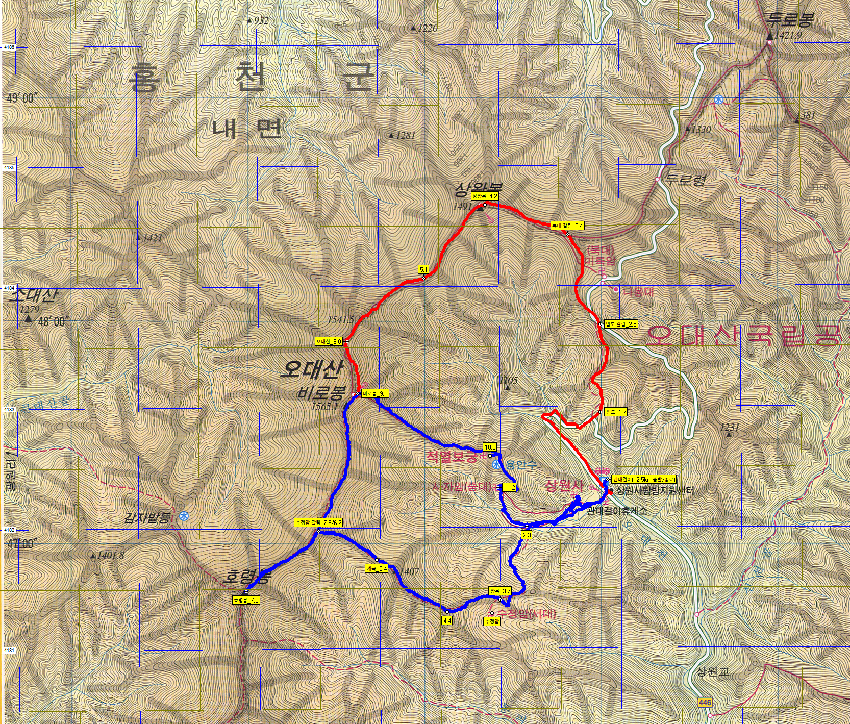 2팀: 상원사~적멸보궁~비로봉~서대 삼거리~호령봉(왕복)~서대(수정암)~상원 주차장