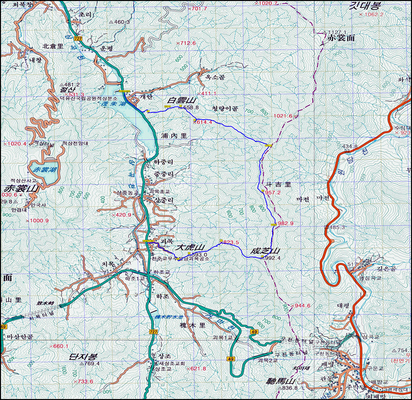 1팀: 원괴목~대호산~성지산~백운산 삼거리(좌능선 진행)~백운산~무주호 홍보관