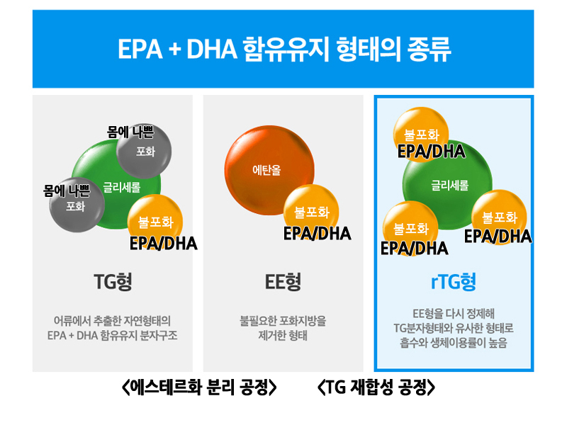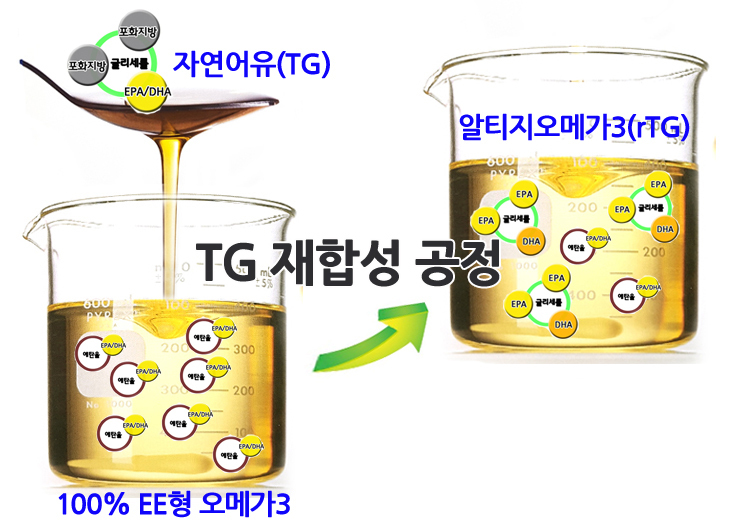rTG 알티지 오메가3는 정제된 EE 오메가3를 다시 천연 자연상태 오메가3인 TG 오메가3로 재합성 오메가3를 알티지 오메가3라고 부릅니다.