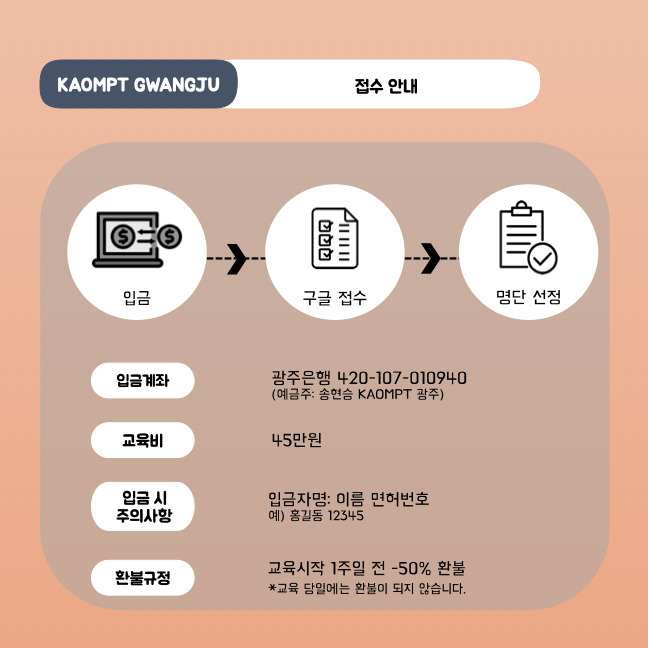 대한정형도수물리치료학회의 모든 교육은 소개강좌 이수와 중앙회 준회원 등록, 당해 연회비 납부해야 접수 및 수강이 가능합니다.