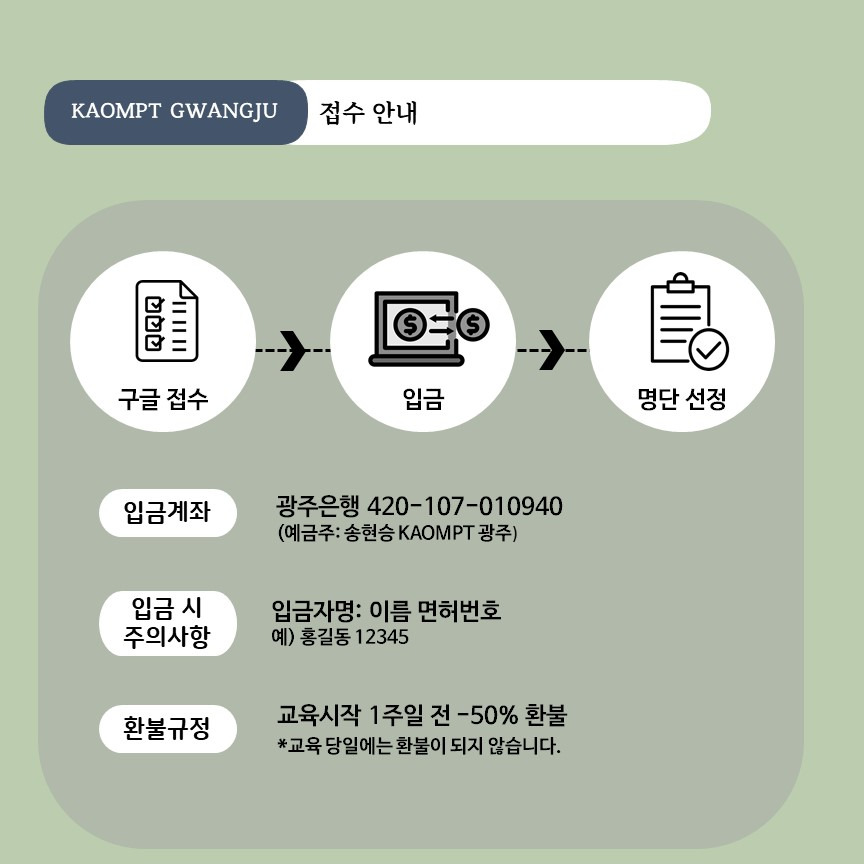 대한정형도수물리치료학회의 모든 교육은 소개강좌 이수와 중앙회 준회원 등록, 당해 연회비 납부해야 접수 및 수강이 가능합니다.