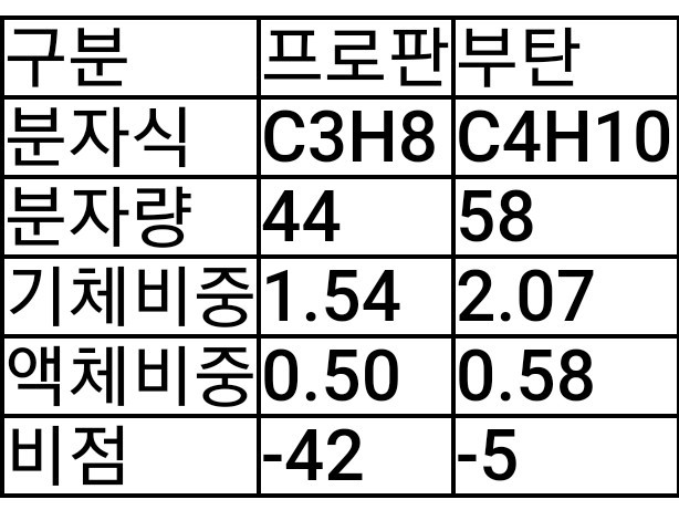 위와 같이 부탄과 프로판의 순발열량차이가 있습니다.
