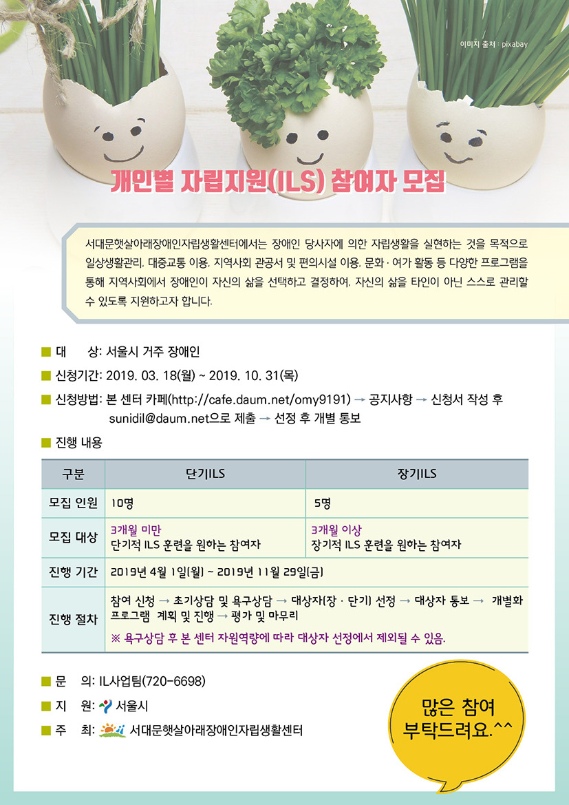 위와 같이 개인별 자립지원(ILS)참여자 모집을 하오니 많은 관심과 참여부탁드립니다.^^