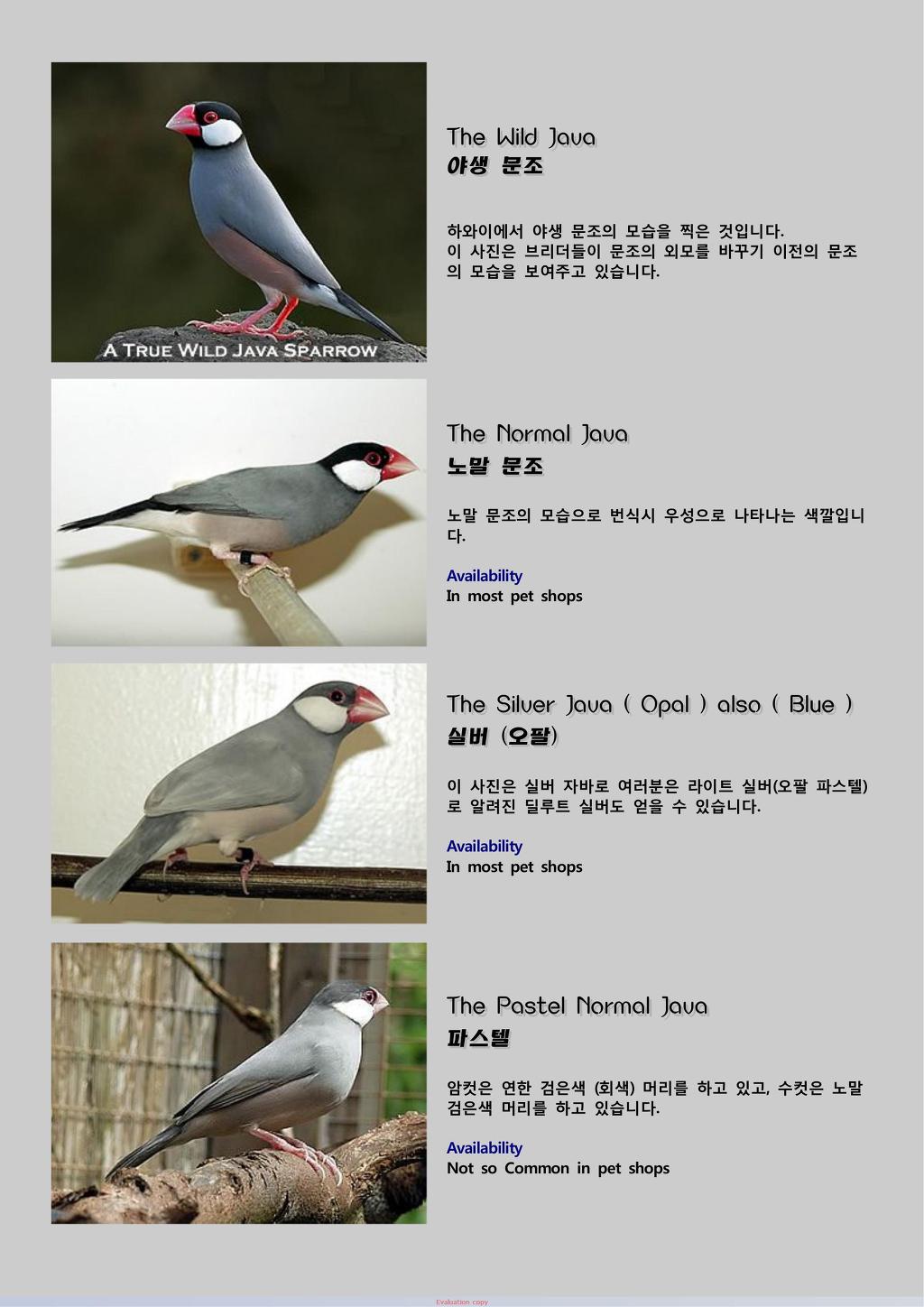 아직, 국내에는 볼 수 없는 종들도 있지만, 문조 품종 개량을 위해 힘쓰시는 분들이 계시기 때문에 언젠가는