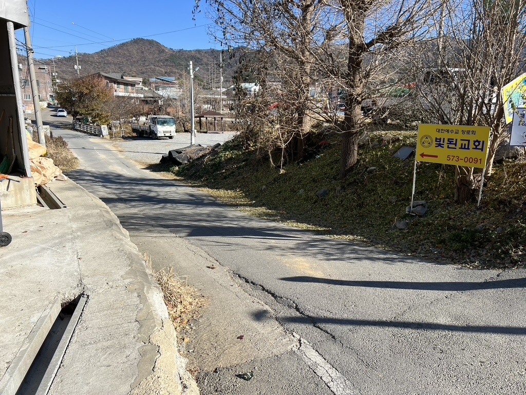 쭉 따라 들어오시다가 오른쪽으로 산, 왼쪽으로 빌라가 보이면 저 끝에서 왼쪽으로 접어드세요.