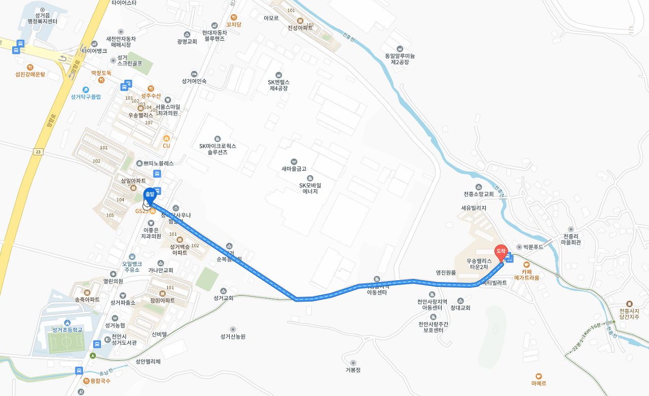 성거읍 천흥리 정류장에서 내린 뒤 GS25 옆길로 15~20분 가량 쭉 걸어서 들어오시면 됩니다.