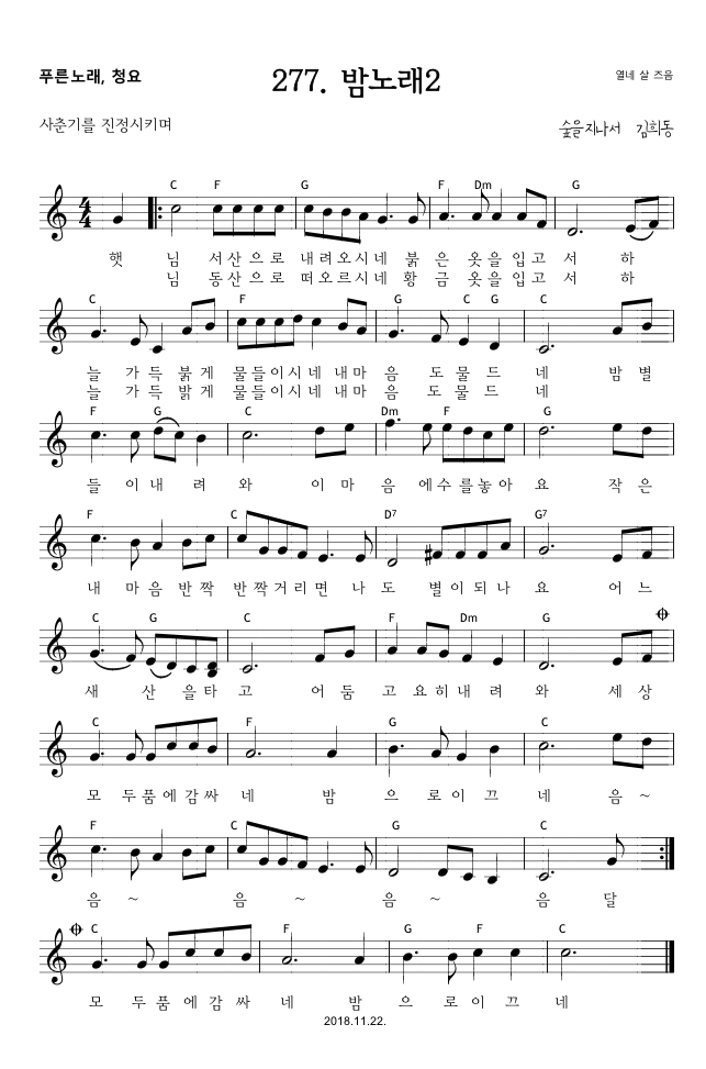 [김희동 노래] 277 밤노래2 작성자숲을지나서|작성시간19.07.07|조회수268 목록 댓글 2 글자크기 작게가 글자크기 크게가 노래꽃 모임봉원교회2019년 7월 6일김희동 노래집 => 딸깍 다음검색 현재 게시글 추가 기능 열기 북마크 신고 센터로 신고 댓글 댓글 2 댓글쓰기 답글쓰기 댓글 리스트 작성자annawell | 작성시간 19.07.22 아이들이 유치원에 다닐 때 선생님 노래집으로 배워 즐겁게 불렀고, 아직도 아침마다, 계절마다 떠오르면 함께 부릅니다. 이제 사춘기가 된 아이들과 이 노래를 배우고 함께 불러야겠네요! 감사합니다~ 작성자행복의 나라로 | 작성시간 19.08.01 직장맘으로 아침에 아이에게 빨리빨리만 강조했던 거 같네요ㅜ ㅜ 앞으로 더 노력하는 엄마가 되어야 겠다는 생각을 해봅니다. 댓글 전체보기