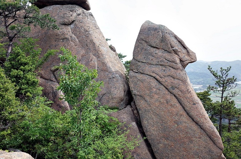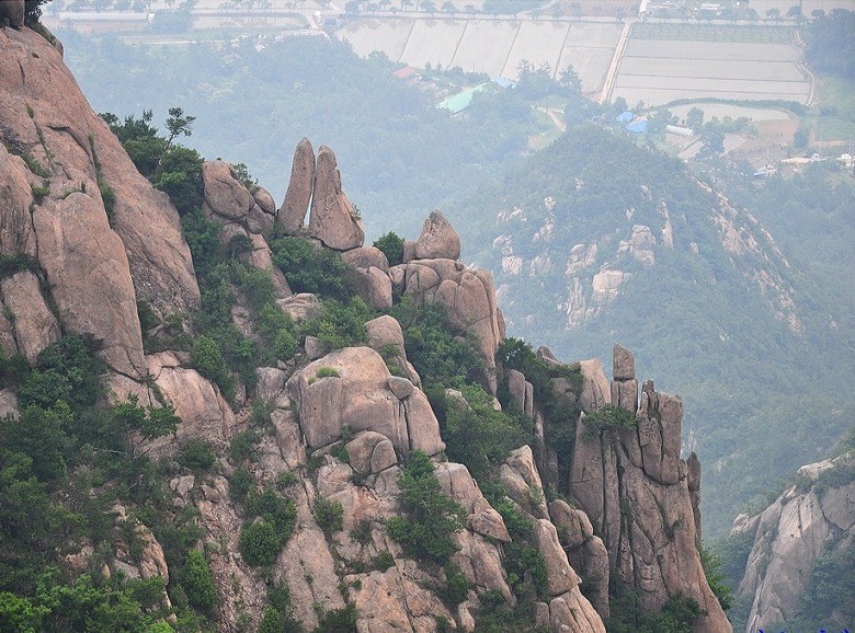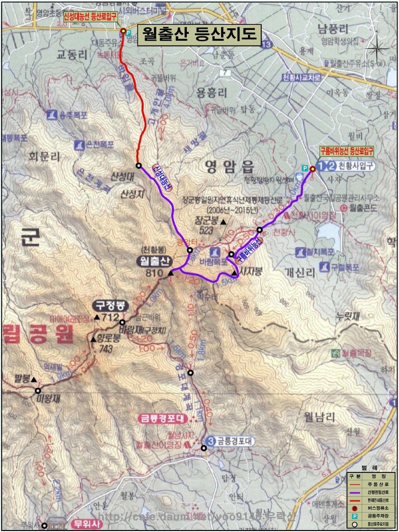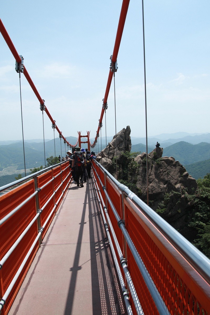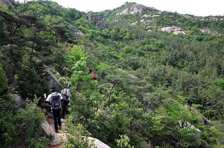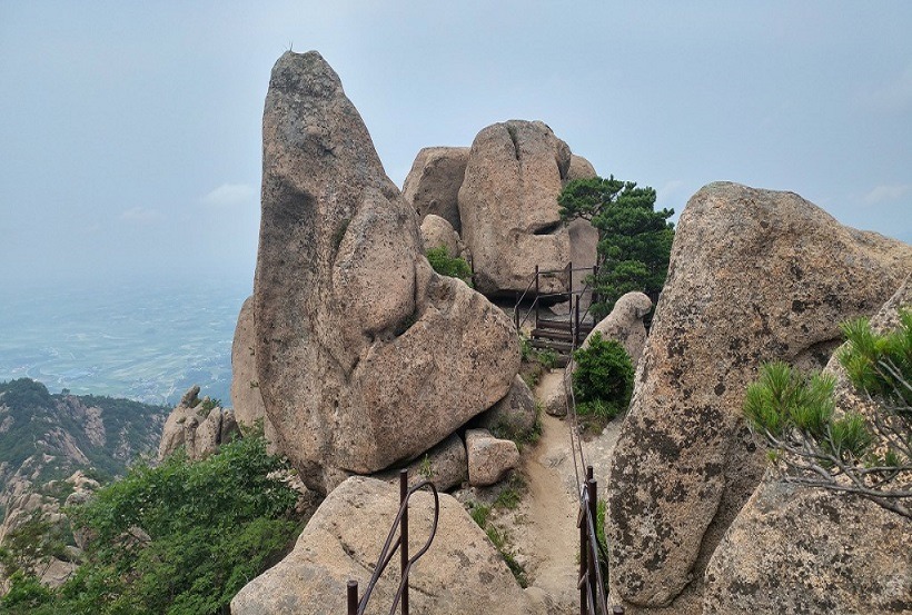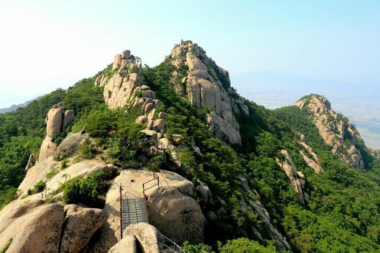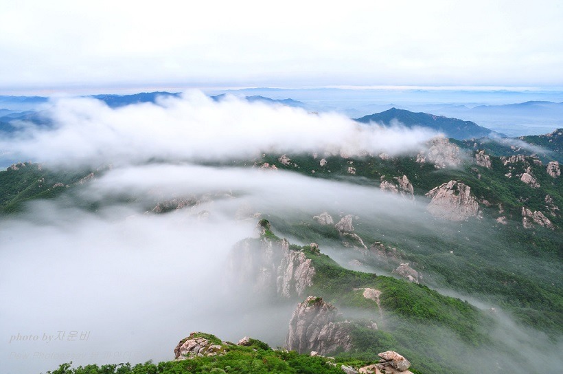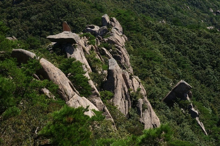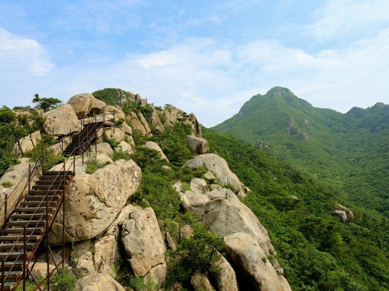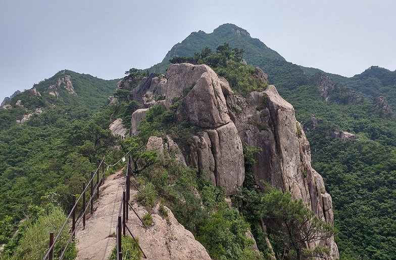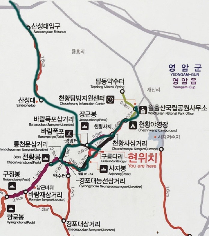♣ 월출산(809m) 월출산(809m)은 전남 영암군에 위치하고 있으며, 영암군에 들어서면 멀리서도 산 전체가 기암괴석으로 이뤄져 호남의 금강산이라는 말이 실감케 한다. "달이 뜬다 달이 뜬다 월출산 천황봉에 보름달이 뜬다" 영암아리랑 노랫말이 말해주듯 월출산은 산봉우리와 달뜨는 광경의 어울림이 빼어난 산이다. 구름을 걸친 채 갑자기 우뚝 솟아 눈앞에 다가서는 천황봉의 신령스러운 모습, 그 위로 떠오른 보름달의 자태는 달맞이 산행의 명산이기도하다. 지리산, 내장산, 천관산, 변산 등과 더불어 “호남의 5대 명산”으로 불리며, 1988년6월에 국립공원으로 지정됐으며 소백산맥이 목포 앞바다로 흘러가다 평지에 돌출된 잔구 형태의 월출산은 천황봉(809m)을 중심으로 구정봉, 향로봉, 장군봉, 매봉, 시루봉, 주지봉, 죽순봉 등 기기묘묘한 암봉으로 산 전체가 수석의 전시장이라 할 만큼 기암괴석으로 이루어져 있다. 전라남도의 남단이며 육지와 바다를 구분하는 것처럼 우뚝선 월출산은 서해에 인접해 있고 달을 가장 먼저 맞이하는 곳이라고 하여 월출산이라 한다. 지리산, 무등산, 조계산 등 남도의 산들이 대부분 완만한 흙산인데 비해 월출산은 숲을 찾아보기 힘들 정도의 바위산에다 깎아지른 산세가 차라리 설악산과 비슷하다. 뾰족뾰족 성곽모양 바위능선, 원추형 또는 돔형으로 된 갖가지 바위나 바위표면이 둥그렇게 팬 나마 등은 설악산보다도 더 기이해 호남의 소금강이라 한다. 바람폭포 옆의 시루봉과 매봉을 연결하는 구름다리는 지상 120미터 높이에 건설된 길이 52m, 폭 0.6m의 월출산의 명물이다. 사자봉 왼쪽 산 중턱 계곡에서는 폭포수가 무려 일곱차례나 연거푸 떨어지는 칠치폭포의 장관을 볼 수 있다. 월출산은 서해를 배경으로 펼쳐지는 일몰풍경이 장관이고, 봄에는 진달래와 철쭉꽃, 여름에는 시원한 폭포수와 천황봉에 항상 걸려있는 운해, 가을에는 붉은 단풍과 미왕재에서 펼쳐지는 광활한 억새밭의 장관을 볼 수 있으며 평야의 들바람과 영산강 강바람이 맞부딪쳐 천황봉 정상에서 만들어내는 구름바다가 볼 만하다. 월출산에서 화강암 지형, 즉 기암괴석들을 가장 잘 볼 수 있는 곳은 구정봉에서 정상인 천황봉을 거쳐 천황사로 이어지는 동북능선이다. 정상을 이루는 바위표면에 가마솥 같은 나마가 9개나 패어 있는 봉우리 구정봉(九鼎峰)에 오르면 사방으로 펼쳐지는 기암괴석이 보는 이를 압도한다. 한편 월출산의 숨겨진 비경인 산성대에서 광암터 삼거리까지의 산성대 코스가 2015년 10월 29일부터 개방되었다. 월출산국립공원가운데 이번에 개방된 산성대 코스는 고인돌바위 등 가장 빼어난 기암절벽의 장관이 연출되는 곳으로서 월출산의 비경 가운데 그동안 일반 등산객들에게는 잘 알려져 있지 않은 아름다운 경치를 볼 수 있는 코스라고 할 수 있다. 또한 광암터를 지나 최고봉인 천황봉을 최단 시간에 오를 수 있는 코스로, 과거 영암읍민들이 자주 이용해왔던 등산로이기도 하다. 기 체육공원∼산성대∼광암터' 탐방로는 총연장 3.3㎞로, 기 체육공원에서 산성치까지 1.8㎞ 구간은 기존에 개방되어 있었고, 산성치에서 광암터까지 1.5㎞ 구간은 추락위험 등 안전사고 발생우려 등을 감안해 통제되어 있었다.