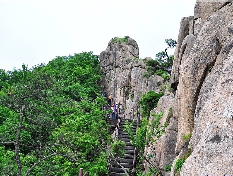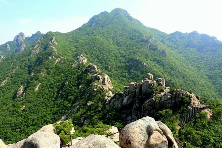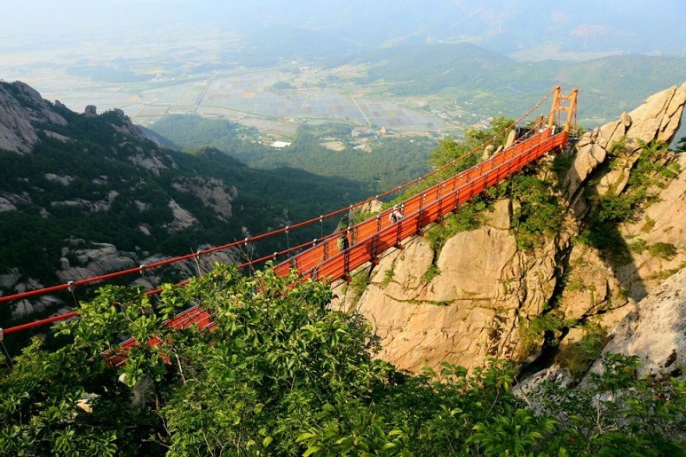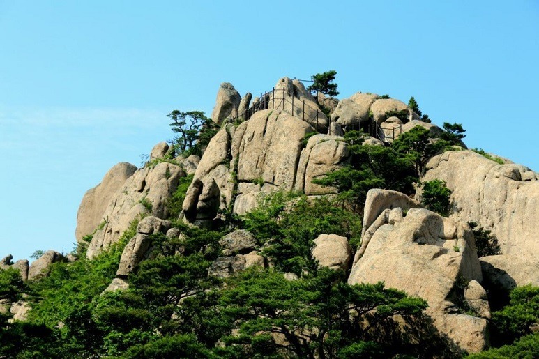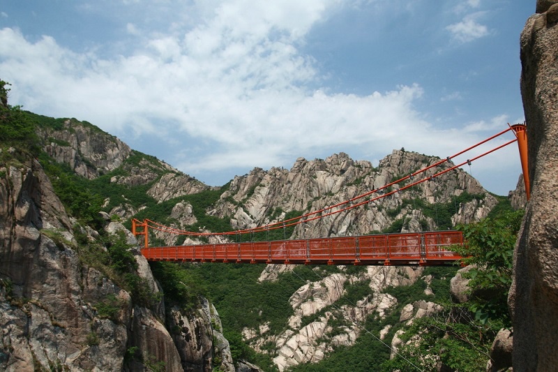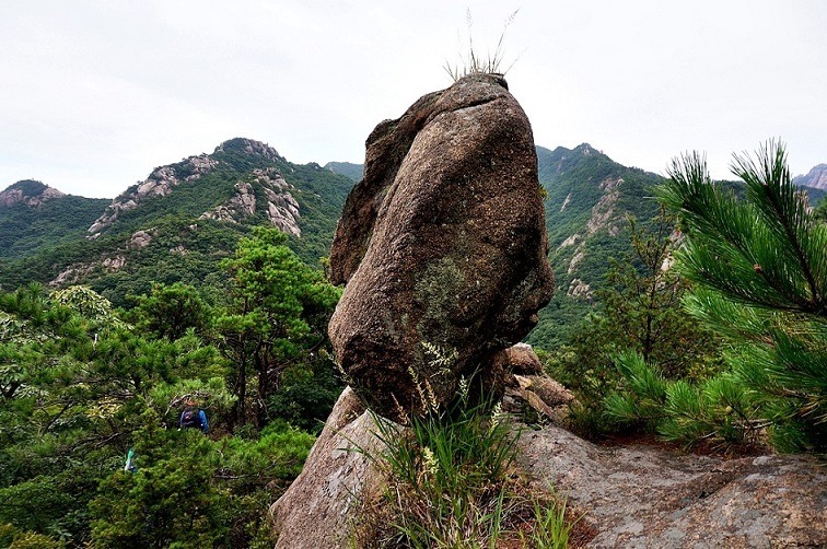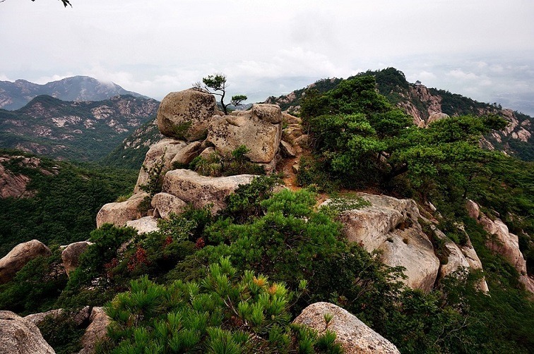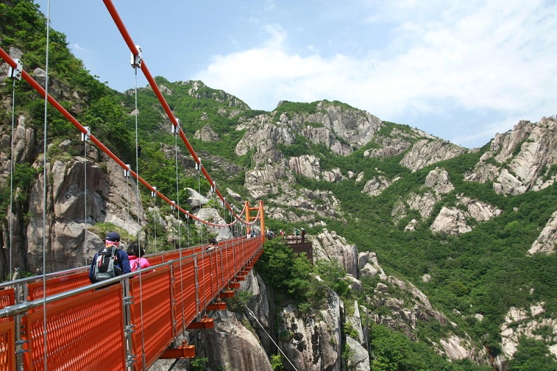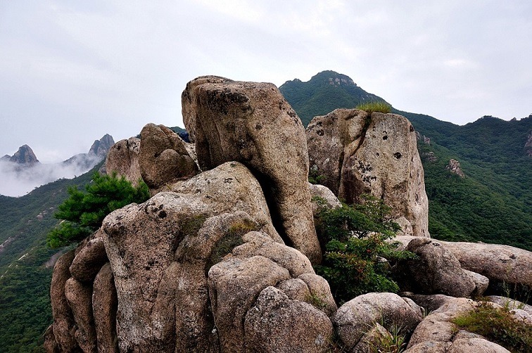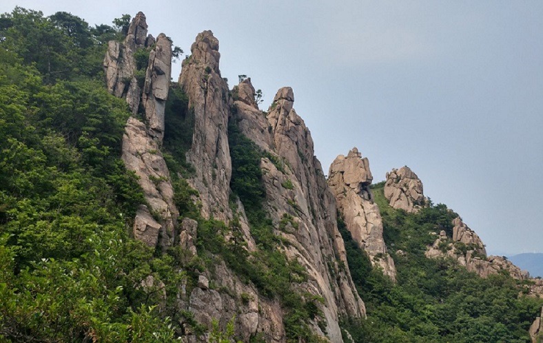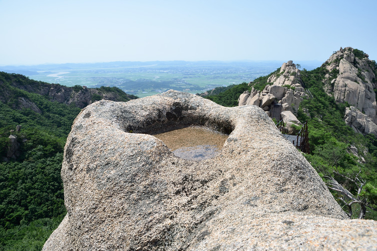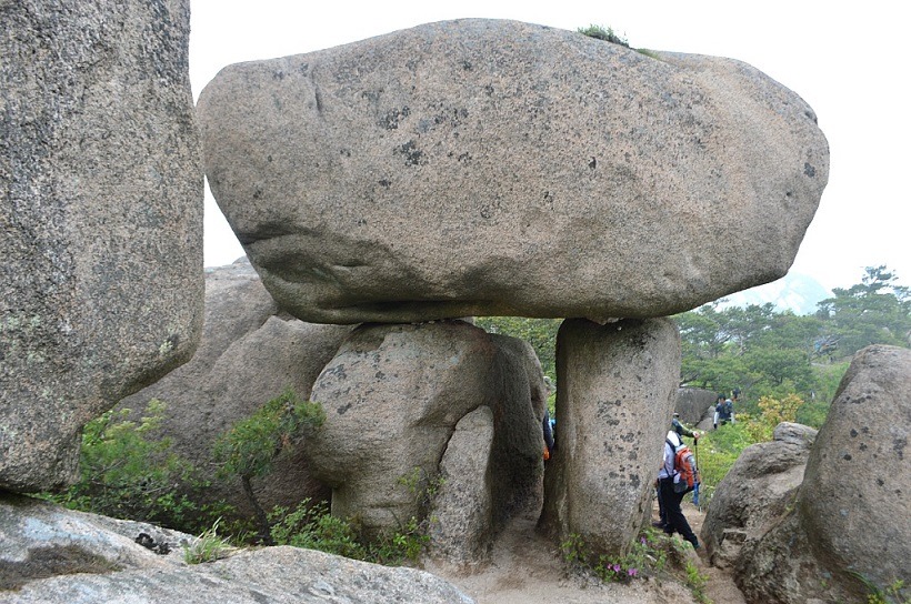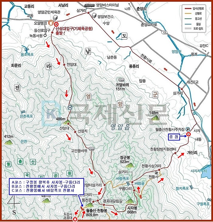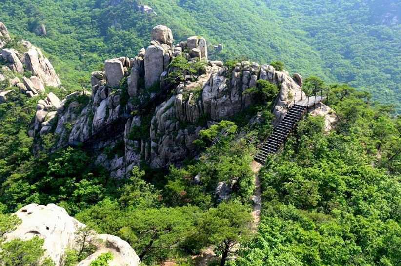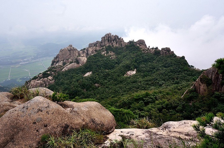 ♣ 월출산(809m) 월출산(809m)은 전남 영암군에 위치하고 있으며, 영암군에 들어서면 멀리서도 산 전체가 기암괴석으로 이뤄져 호남의 금강산이라는 말이 실감케 한다. "달이 뜬다 달이 뜬다 월출산 천황봉에 보름달이 뜬다" 영암아리랑 노랫말이 말해주듯 월출산은 산봉우리와 달뜨는 광경의 어울림이 빼어난 산이다. 구름을 걸친 채 갑자기 우뚝 솟아 눈앞에 다가서는 천황봉의 신령스러운 모습, 그 위로 떠오른 보름달의 자태는 달맞이 산행의 명산이기도하다. 지리산, 내장산, 천관산, 변산 등과 더불어 “호남의 5대 명산”으로 불리며, 1988년6월에 국립공원으로 지정됐으며 소백산맥이 목포 앞바다로 흘러가다 평지에 돌출된 잔구 형태의 월출산은 천황봉(809m)을 중심으로 구정봉, 향로봉, 장군봉, 매봉, 시루봉, 주지봉, 죽순봉 등 기기묘묘한 암봉으로 산 전체가 수석의 전시장이라 할 만큼 기암괴석으로 이루어져 있다. 전라남도의 남단이며 육지와 바다를 구분하는 것처럼 우뚝선 월출산은 서해에 인접해 있고 달을 가장 먼저 맞이하는 곳이라고 하여 월출산이라 한다. 지리산, 무등산, 조계산 등 남도의 산들이 대부분 완만한 흙산인데 비해 월출산은 숲을 찾아보기 힘들 정도의 바위산에다 깎아지른 산세가 차라리 설악산과 비슷하다. 뾰족뾰족 성곽모양 바위능선, 원추형 또는 돔형으로 된 갖가지 바위나 바위표면이 둥그렇게 팬 나마 등은 설악산보다도 더 기이해 호남의 소금강이라 한다. 바람폭포 옆의 시루봉과 매봉을 연결하는 구름다리는 지상 120미터 높이에 건설된 길이 52m, 폭 0.6m의 월출산의 명물이다. 사자봉 왼쪽 산 중턱 계곡에서는 폭포수가 무려 일곱차례나 연거푸 떨어지는 칠치폭포의 장관을 볼 수 있다. 월출산은 서해를 배경으로 펼쳐지는 일몰풍경이 장관이고, 봄에는 진달래와 철쭉꽃, 여름에는 시원한 폭포수와 천황봉에 항상 걸려있는 운해, 가을에는 붉은 단풍과 미왕재에서 펼쳐지는 광활한 억새밭의 장관을 볼 수 있으며 평야의 들바람과 영산강 강바람이 맞부딪쳐 천황봉 정상에서 만들어내는 구름바다가 볼 만하다. 월출산에서 화강암 지형, 즉 기암괴석들을 가장 잘 볼 수 있는 곳은 구정봉에서 정상인 천황봉을 거쳐 천황사로 이어지는 동북능선이다. 정상을 이루는 바위표면에 가마솥 같은 나마가 9개나 패어 있는 봉우리 구정봉(九鼎峰)에 오르면 사방으로 펼쳐지는 기암괴석이 보는 이를 압도한다. 한편 월출산의 숨겨진 비경인 산성대에서 광암터 삼거리까지의 산성대 코스가 2015년 10월 29일부터 개방되었다. 월출산국립공원가운데 이번에 개방된 산성대 코스는 고인돌바위 등 가장 빼어난 기암절벽의 장관이 연출되는 곳으로서 월출산의 비경 가운데 그동안 일반 등산객들에게는 잘 알려져 있지 않은 아름다운 경치를 볼 수 있는 코스라고 할 수 있다. 또한 광암터를 지나 최고봉인 천황봉을 최단 시간에 오를 수 있는 코스로, 과거 영암읍민들이 자주 이용해왔던 등산로이기도 하다. 기 체육공원∼산성대∼광암터' 탐방로는 총연장 3.3㎞로, 기 체육공원에서 산성치까지 1.8㎞ 구간은 기존에 개방되어 있었고, 산성치에서 광암터까지 1.5㎞ 구간은 추락위험 등 안전사고 발생우려 등을 감안해 통제되어 있었다.
