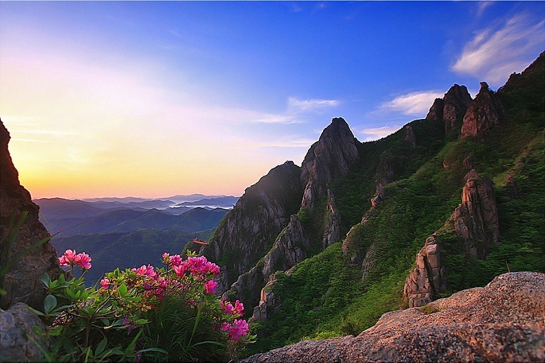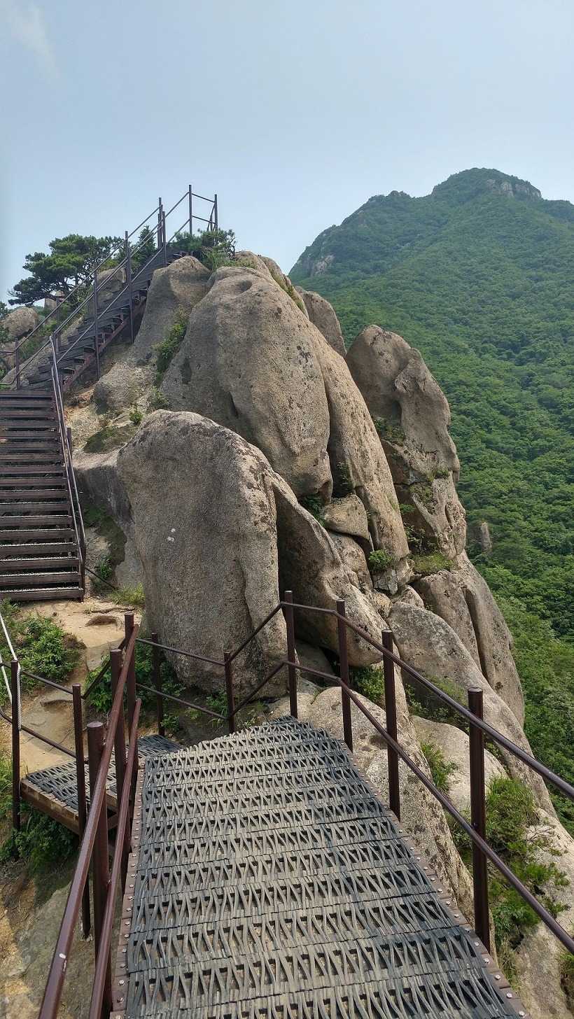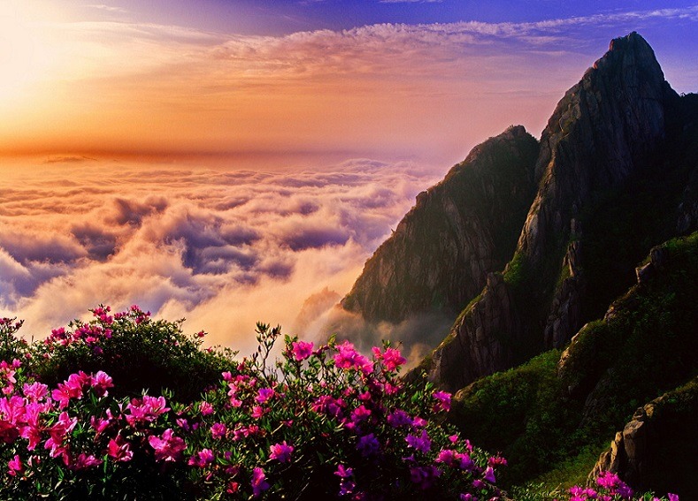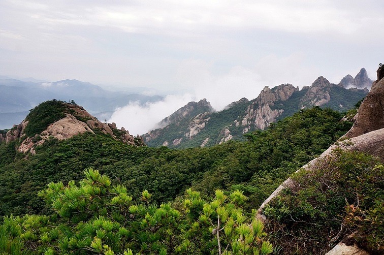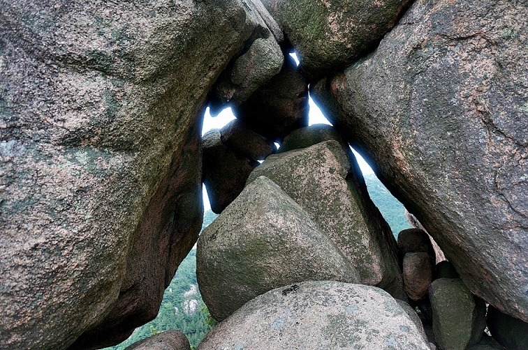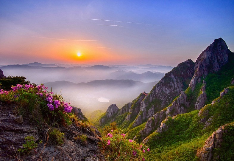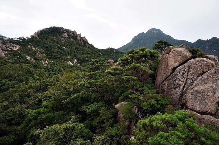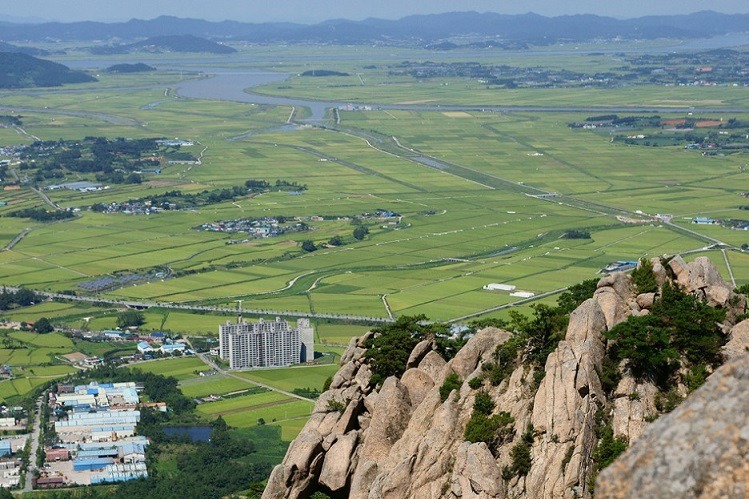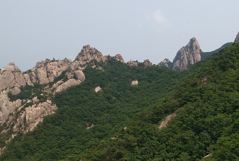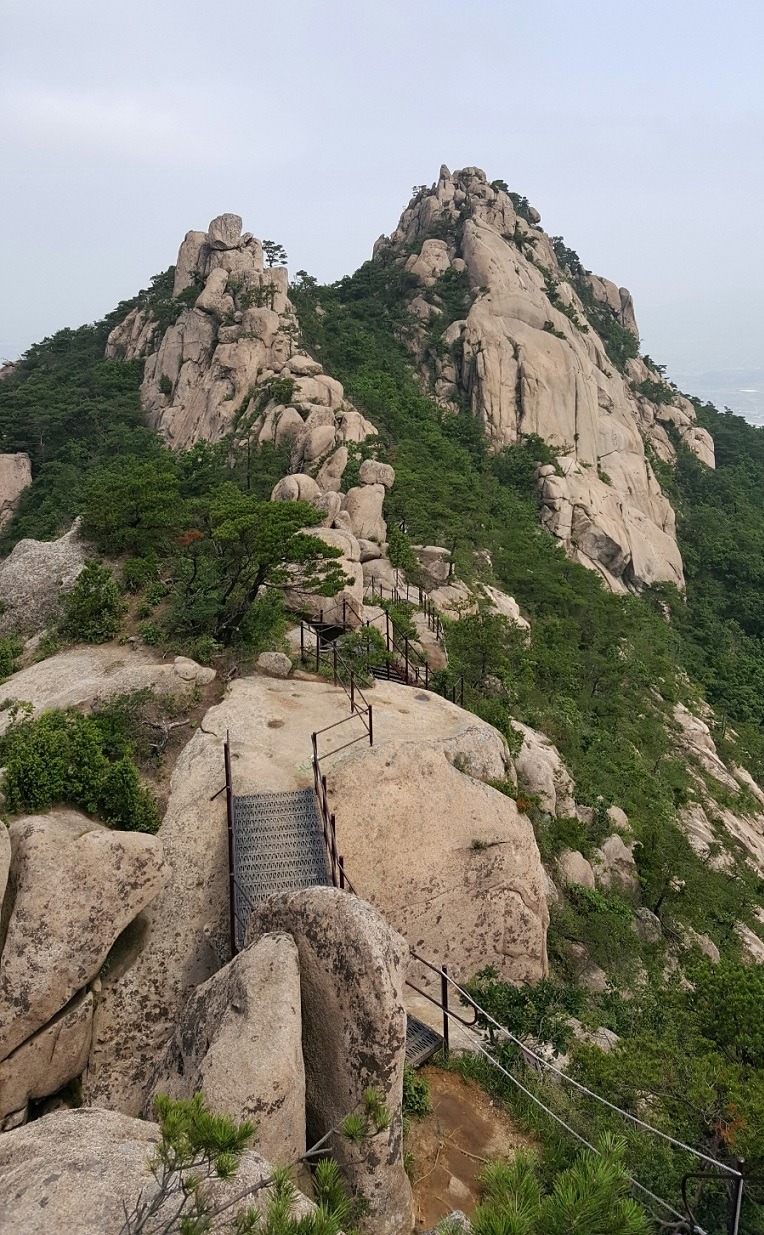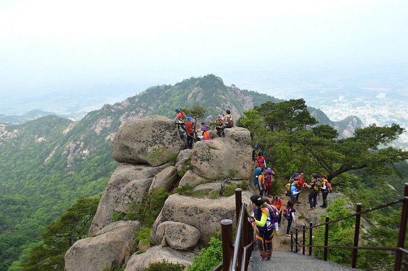 ♣ 월출산(809m) 월출산(809m)은 전남 영암군에 위치하고 있으며, 영암군에 들어서면 멀리서도 산 전체가 기암괴석으로 이뤄져 호남의 금강산이라는 말이 실감케 한다. "달이 뜬다 달이 뜬다 월출산 천황봉에 보름달이 뜬다" 영암아리랑 노랫말이 말해주듯 월출산은 산봉우리와 달뜨는 광경의 어울림이 빼어난 산이다. 구름을 걸친 채 갑자기 우뚝 솟아 눈앞에 다가서는 천황봉의 신령스러운 모습, 그 위로 떠오른 보름달의 자태는 달맞이 산행의 명산이기도하다. 지리산, 내장산, 천관산, 변산 등과 더불어 “호남의 5대 명산”으로 불리며, 1988년6월에 국립공원으로 지정됐으며 소백산맥이 목포 앞바다로 흘러가다 평지에 돌출된 잔구 형태의 월출산은 천황봉(809m)을 중심으로 구정봉, 향로봉, 장군봉, 매봉, 시루봉, 주지봉, 죽순봉 등 기기묘묘한 암봉으로 산 전체가 수석의 전시장이라 할 만큼 기암괴석으로 이루어져 있다. 전라남도의 남단이며 육지와 바다를 구분하는 것처럼 우뚝선 월출산은 서해에 인접해 있고 달을 가장 먼저 맞이하는 곳이라고 하여 월출산이라 한다. 지리산, 무등산, 조계산 등 남도의 산들이 대부분 완만한 흙산인데 비해 월출산은 숲을 찾아보기 힘들 정도의 바위산에다 깎아지른 산세가 차라리 설악산과 비슷하다. 뾰족뾰족 성곽모양 바위능선, 원추형 또는 돔형으로 된 갖가지 바위나 바위표면이 둥그렇게 팬 나마 등은 설악산보다도 더 기이해 호남의 소금강이라 한다. 바람폭포 옆의 시루봉과 매봉을 연결하는 구름다리는 지상 120미터 높이에 건설된 길이 52m, 폭 0.6m의 월출산의 명물이다. 사자봉 왼쪽 산 중턱 계곡에서는 폭포수가 무려 일곱차례나 연거푸 떨어지는 칠치폭포의 장관을 볼 수 있다. 월출산은 서해를 배경으로 펼쳐지는 일몰풍경이 장관이고, 봄에는 진달래와 철쭉꽃, 여름에는 시원한 폭포수와 천황봉에 항상 걸려있는 운해, 가을에는 붉은 단풍과 미왕재에서 펼쳐지는 광활한 억새밭의 장관을 볼 수 있으며 평야의 들바람과 영산강 강바람이 맞부딪쳐 천황봉 정상에서 만들어내는 구름바다가 볼 만하다. 월출산에서 화강암 지형, 즉 기암괴석들을 가장 잘 볼 수 있는 곳은 구정봉에서 정상인 천황봉을 거쳐 천황사로 이어지는 동북능선이다. 정상을 이루는 바위표면에 가마솥 같은 나마가 9개나 패어 있는 봉우리 구정봉(九鼎峰)에 오르면 사방으로 펼쳐지는 기암괴석이 보는 이를 압도한다. 한편 월출산의 숨겨진 비경인 산성대에서 광암터 삼거리까지의 산성대 코스가 2015년 10월 29일부터 개방되었다. 월출산국립공원가운데 이번에 개방된 산성대 코스는 고인돌바위 등 가장 빼어난 기암절벽의 장관이 연출되는 곳으로서 월출산의 비경 가운데 그동안 일반 등산객들에게는 잘 알려져 있지 않은 아름다운 경치를 볼 수 있는 코스라고 할 수 있다. 또한 광암터를 지나 최고봉인 천황봉을 최단 시간에 오를 수 있는 코스로, 과거 영암읍민들이 자주 이용해왔던 등산로이기도 하다. 기 체육공원∼산성대∼광암터' 탐방로는 총연장 3.3㎞로, 기 체육공원에서 산성치까지 1.8㎞ 구간은 기존에 개방되어 있었고, 산성치에서 광암터까지 1.5㎞ 구간은 추락위험 등 안전사고 발생우려 등을 감안해 통제되어 있었다.