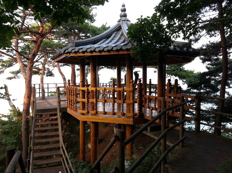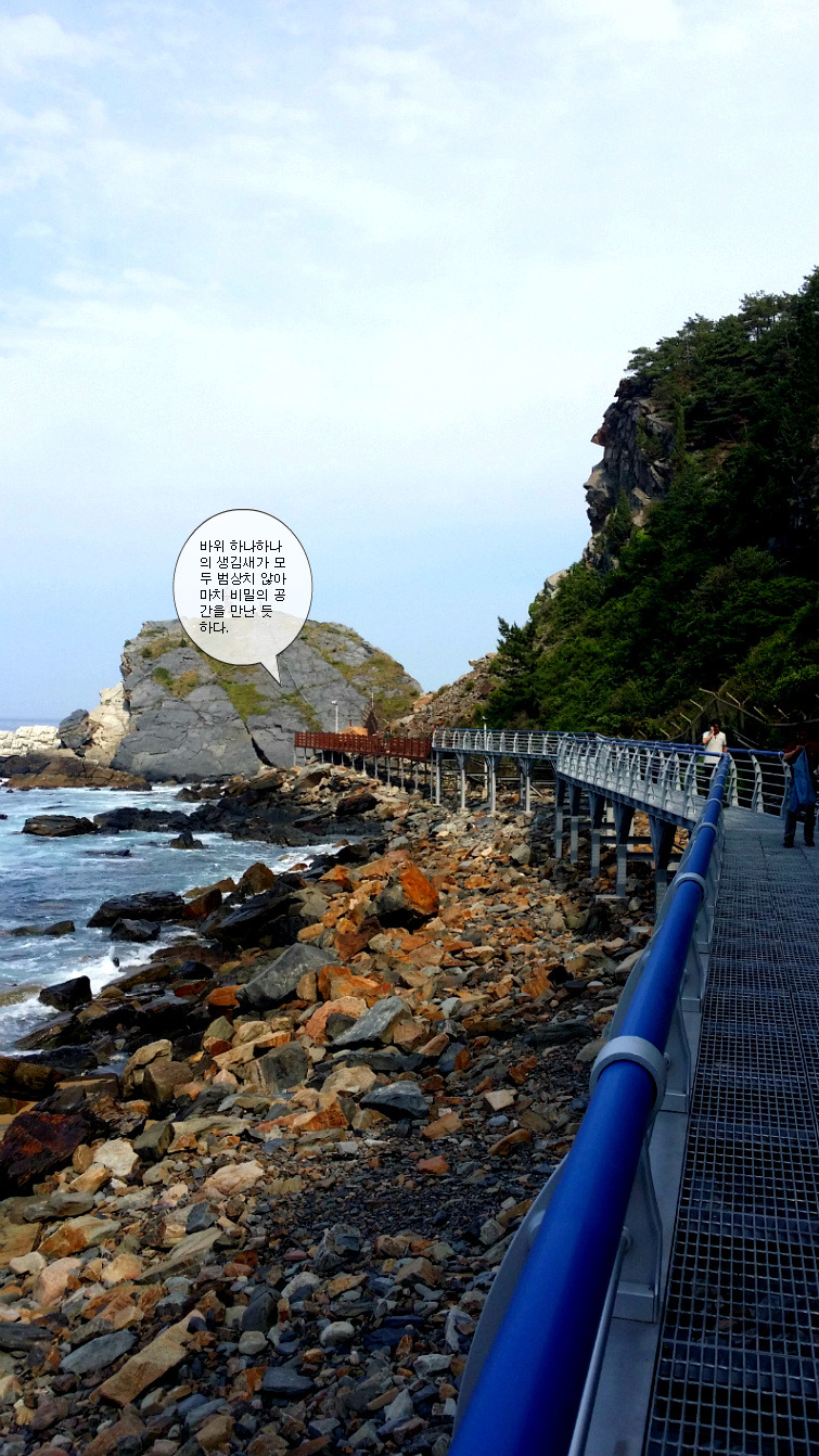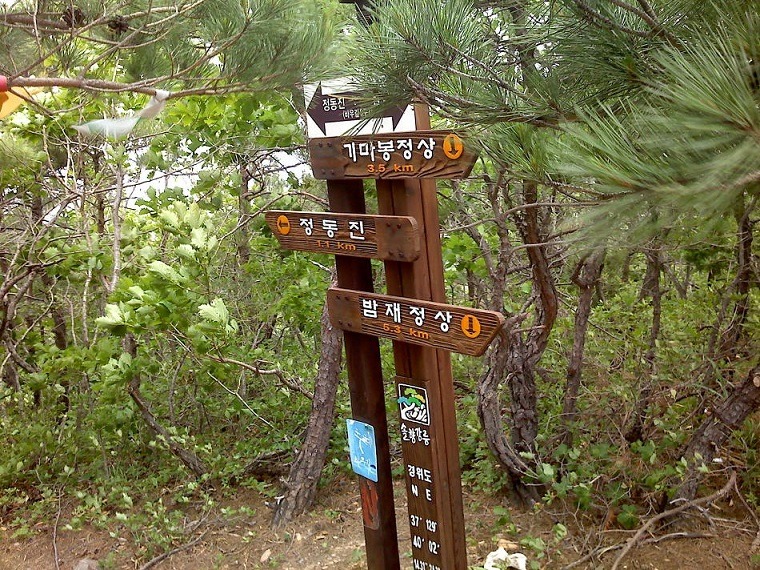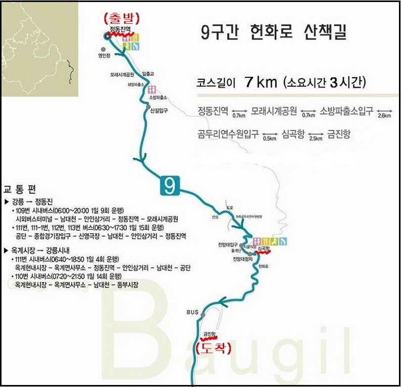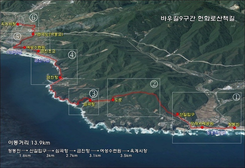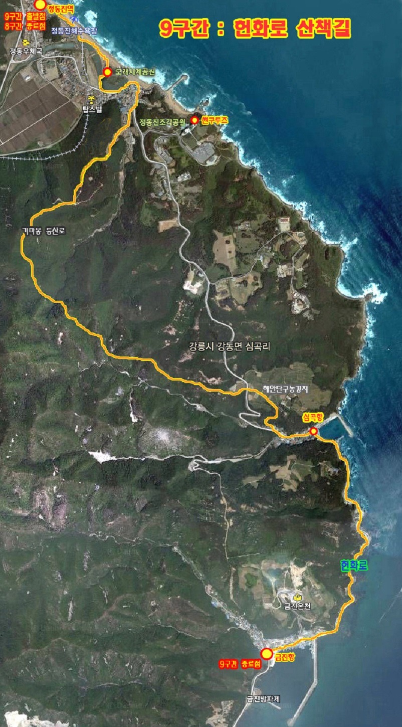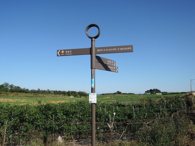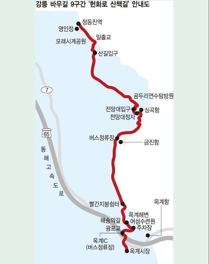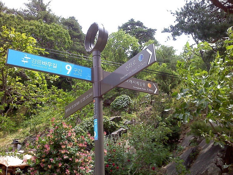 ♣강릉바우길9코스 ▼ 길가에 ‘울트라 바우길’이라는 팻말이 걸려있는 게 보인다. 그렇다면 지금 걷고 있는 이 길이 총 350Km에 이른다는 강릉판 둘레길인 ‘바우길’일지도 모르겠다. 그중의 한 구간이 ‘울트라 바우길’인 것으로 알고 있기 때문이다. ‘바우’는 바위를 가리키는 강원도 사투리이다. 강원도 사람을 친근하게 부를 때는 ‘감자바우’라고 하는데 ‘바우길’은 이 명칭에서 유래했다고 한다. 또한 ‘바우’는 바빌로니아(Babylonia)의 신화(神話)에서는 건강의 여신(女神)으로 나타난다. 손으로 한번 만져 주는 것만으로도 모든 병을 다 낫게 해준다는 여신이다. 이 같은 두 가지의 이미지를(image) 담을 경우 이 길은 특별한 의미를 갖게 된다. 친한 이웃에 마실 나온 기분으로 걸으며 건강을 챙겨가라는 의미 말이다. 그래서 누군가는 이 길을 일러 ‘치유의 길’이라 했다. 걷는 이의 몸과 마음이 함께 건강하길 바라는 마음에서란다. 헌화로 산책길’이자 ‘강릉바우길’의 제9코스를 따른다. 이 코스는 정동진역을 출발해 모래시계공원과 기마봉 초입의 소방파출소, 그리고 곰두리연수원 입구와 심곡항, 금진항을 거쳐 옥계시장에 이르는 총 14㎞의 둘레길이다. 아름답기로 소문난 길이니 염두에 두고 걸어볼 일이다. 참고로 ‘헌화로 산책길’이라는 이름의 모티브(motive)는 신라 성덕왕 때 지어진 향가 ‘헌화가’(獻花歌)다. 내용이야 익히 알려져 있다. 신라시대, 경국지색의 용모를 가진 수로 부인이 강릉 태수를 제수 받은 남편 순정공과 함께 ‘7번 국도’를 따라 부임지로 향하던 길이었다. 수로 부인이 해안가 천길단애에 핀 철쭉꽃을 보며 누군가 저 꽃을 꺾어 주었으면 좋겠다고 혼잣말을 했다. 마침 암소를 몰고 지나던 한 노인이 선뜻 나섰고 그가 꽃을 꺾어 바치며 부른 노래가 헌화가다. 길 이름은 바로 이 옛이야기에서 따왔다고 한다. 인접한 삼척시 해안 절벽에도 같은 전설이 전해져 온다. 오래전부터 수로 부인 공원을 조성하는 등 공을 들였던 삼척시로서는 당혹스러울 법도 하다.