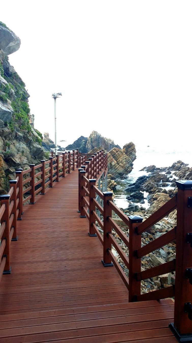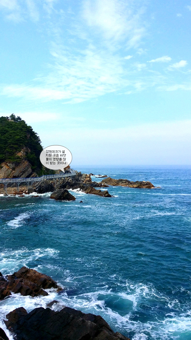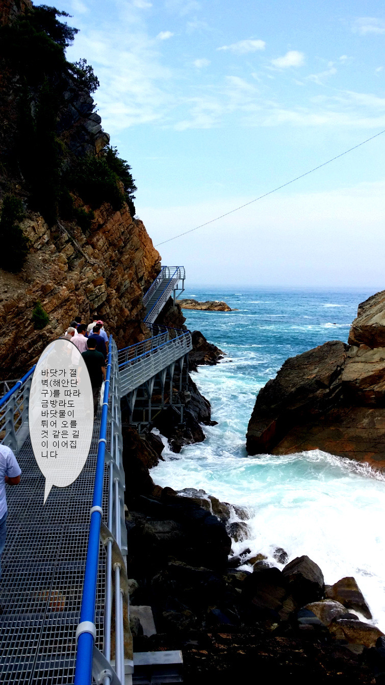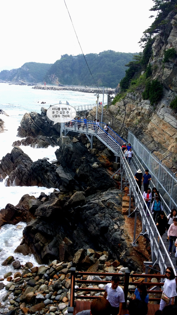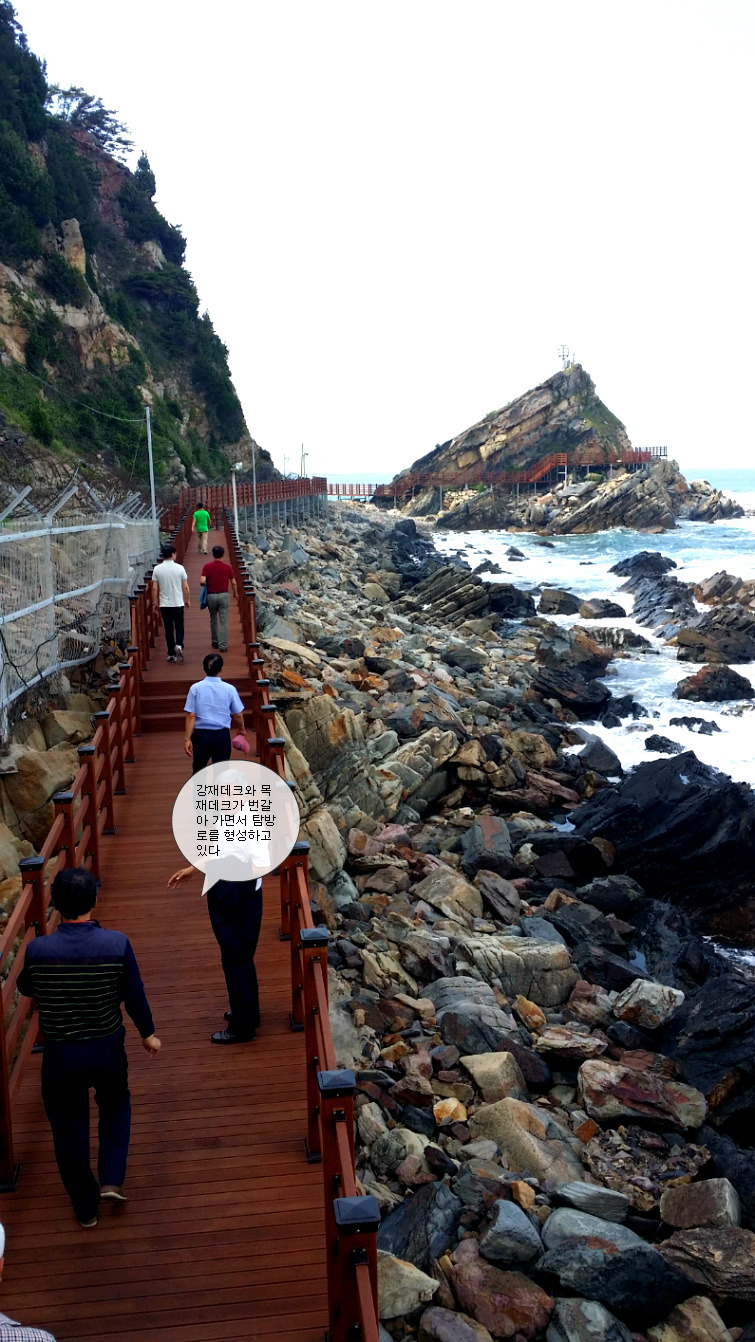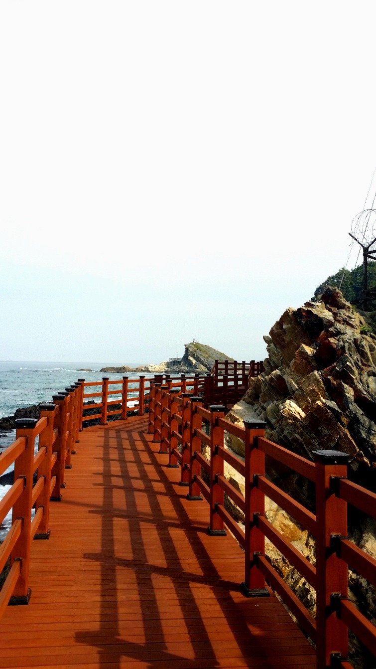 ♣정동진 바다부채길 – (정동진~심곡항) 국내 최장거리 해안단구(천연기념물 제437호) 탐방로인 강릉 정동진∼심곡항 구간 ‘바다부채길’이 2016년 10월 17일부터 일반에 개방되었다. 정동심곡 바다부채길은 지난 2015년 국토부 공모사업인 동서남해안 초광역 개발권 중점사업으로 선정돼 국·도비와 시비 등 모두 70억원을 투입, 총길이 2.86㎞ 규모로 조성되었다. 이번에 탐방로가 개설된 정동진 해안단구는 2,300만년 전 한반도의 지각변동을 관찰할 수 있는 국내 최장의 해안단구지역으로 오랜 세월 파도에 의해 침식되어 형성된 넓은 파식대가 지반 융기나 해수면 하강으로 육지화 된 지역이다. 바다부채길은 분단 이후 해안경비를 위한 군(軍) 순찰로로 사용됐을 뿐, 지금까지 대한민국 건국이래 단 한번도 민간인에게 개방된 적이 없는 곳으로 국방부와 문화재청의 협의기간과 허가기간에만 2년의 시간이 소요되었다고 한다. 정동바다부채길’은 정동지역의 부채끝 지명에서 착안했다. 탐방로가 위치한 지형의 모양이 바다를 향해 부채를 펼쳐놓은 듯한 모양이다. 동해바다의 깨끗하고 탁트인 시원함과 지형 특징을 살린 기억하기 쉽고 부르기 쉬운 명칭으로 작명되었으며. 2016년 10월17일 오후3시 개방되었다