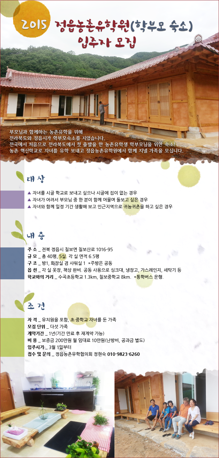 2015 정읍농촌유학원(학부모 숙소) 입주자 모집 작성자밥샘|작성시간15.02.18|조회수25 목록 댓글 0 글자크기 작게가 글자크기 크게가 ★이미지를 클릭하시면 자연학교 다음 카페로 이동합니다. 다음검색 현재 게시글 추가 기능 열기 북마크 공유하기 신고 센터로 신고 댓글 댓글 0 댓글쓰기 답글쓰기 댓글 리스트
